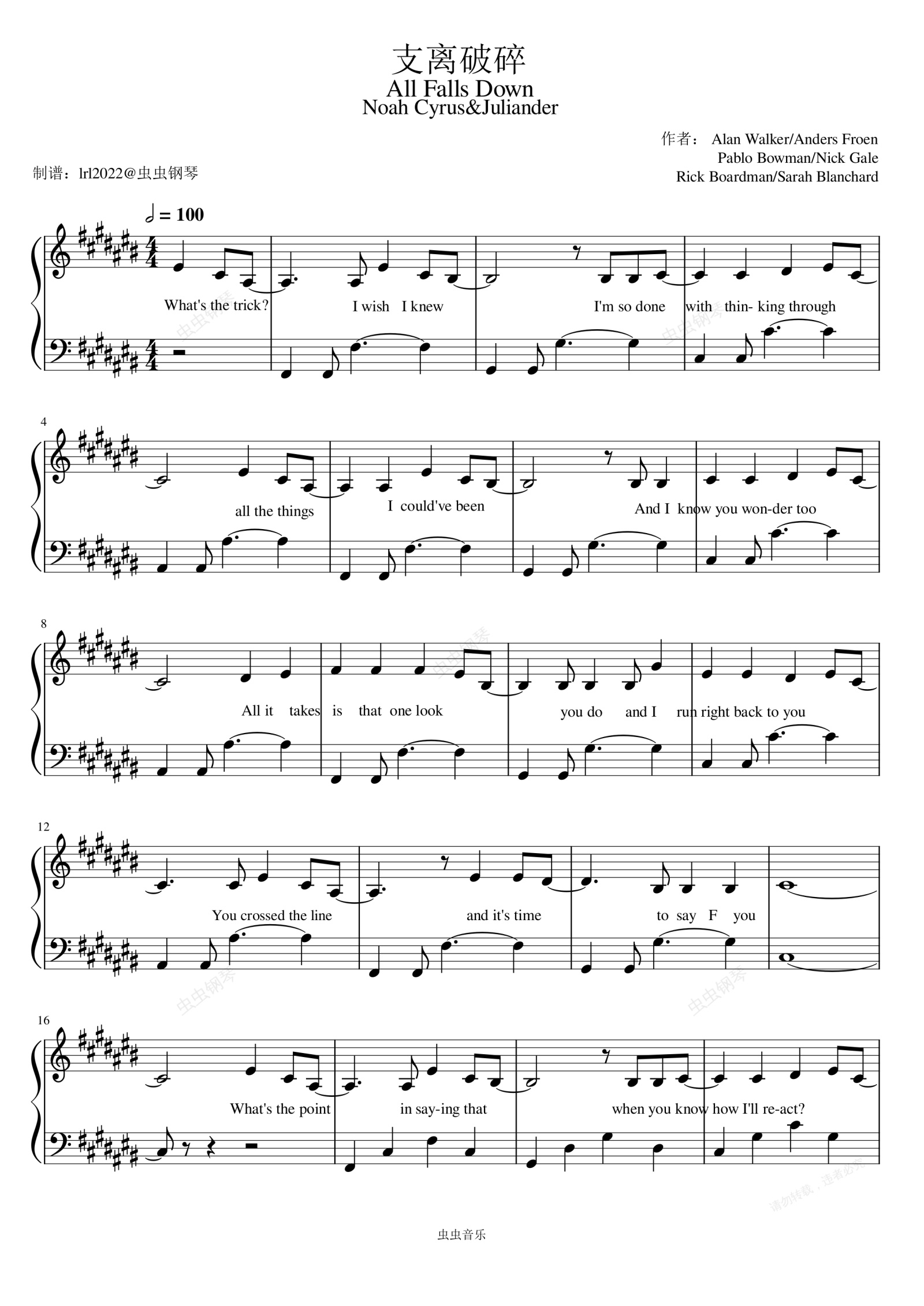 钢琴谱:All Falls Down - Noah Cyrus&Juliander - 支离破碎 - 钢琴伴奏加歌词