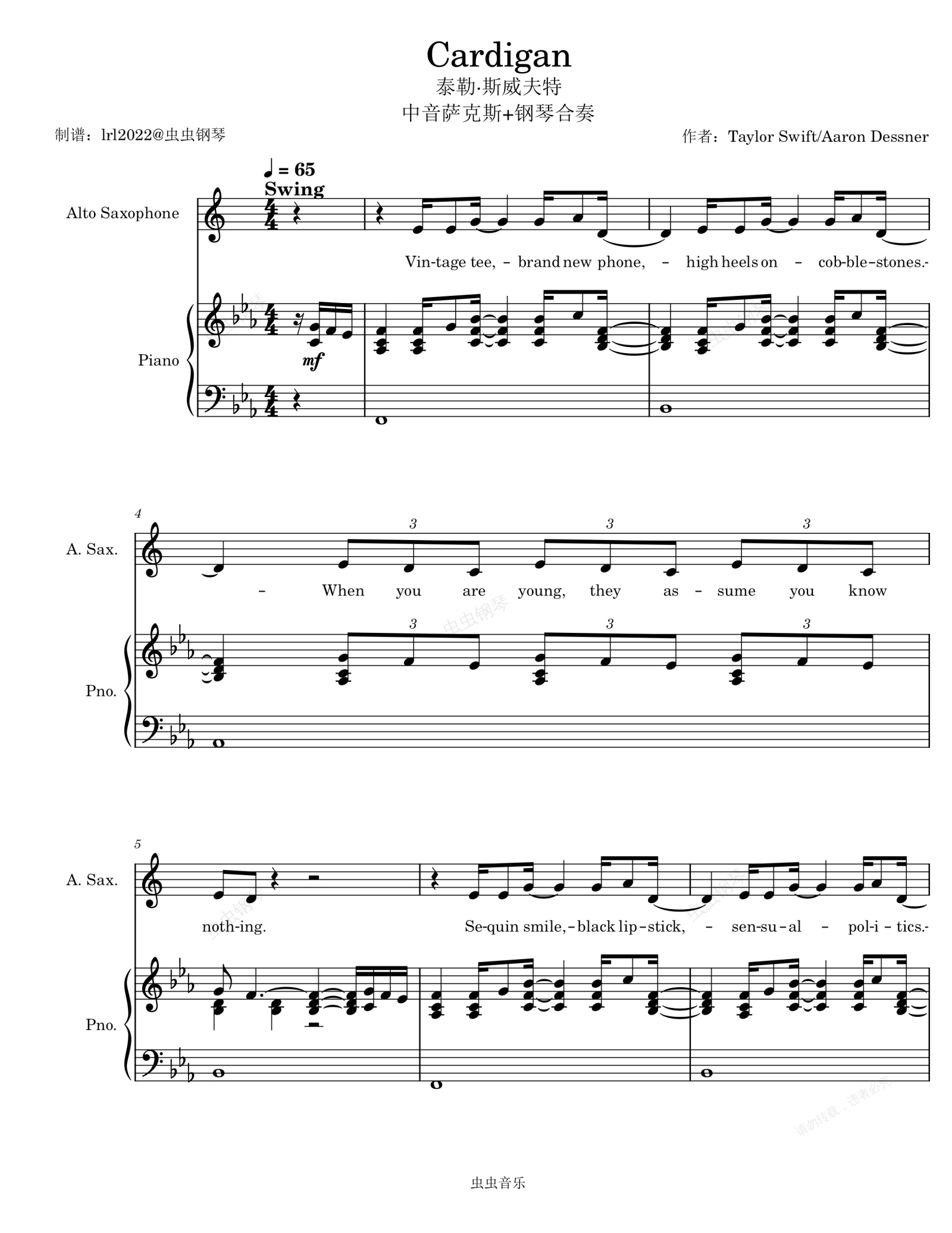 钢琴谱:Cardigan - Taylor Swift - 泰勒·斯威夫特 - 中音萨克斯钢琴合奏