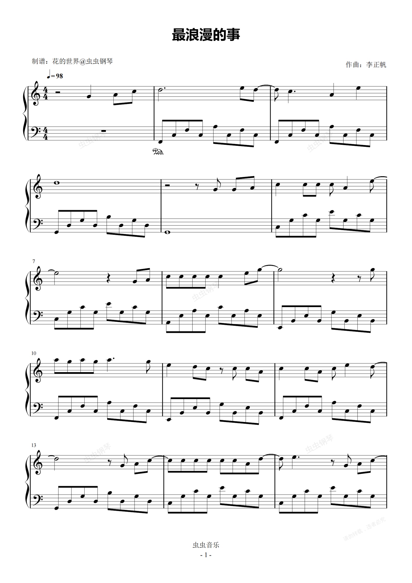 钢琴谱:最浪漫的事 C调简易版 赵咏华