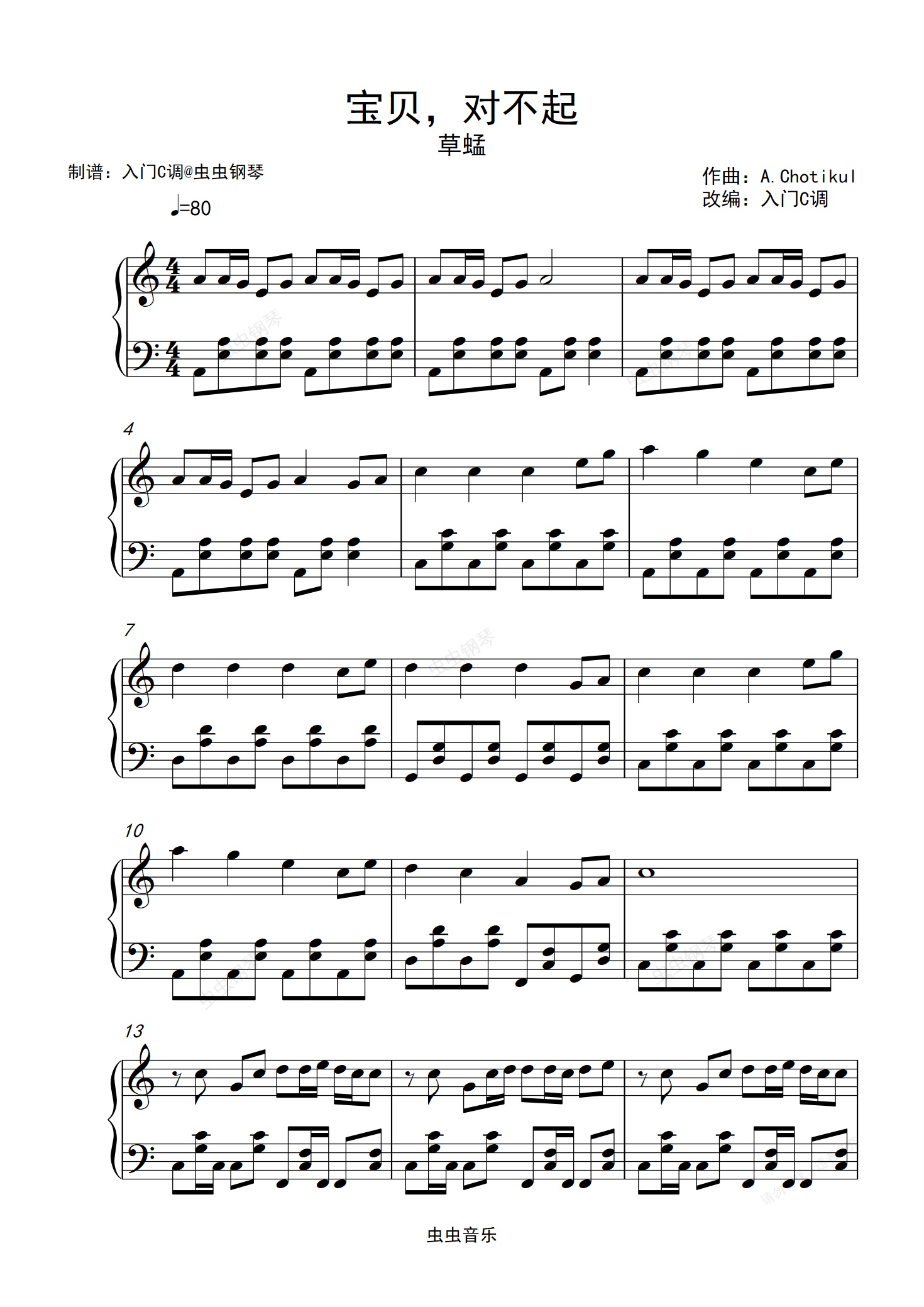 钢琴谱:草蜢《宝贝,对不起》入门C调简单版