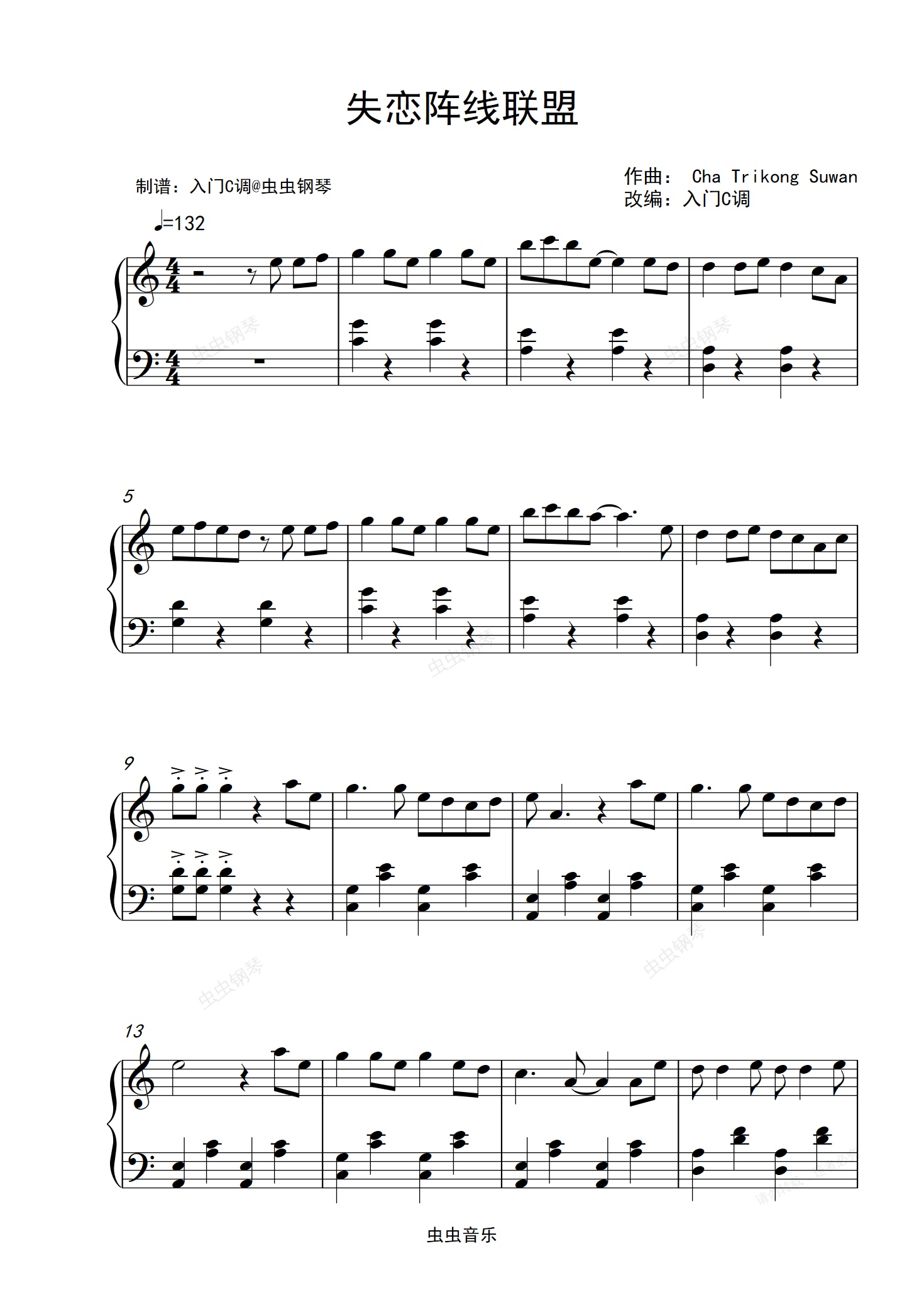 钢琴谱:草蜢《失恋阵线联盟》入门C调简单版