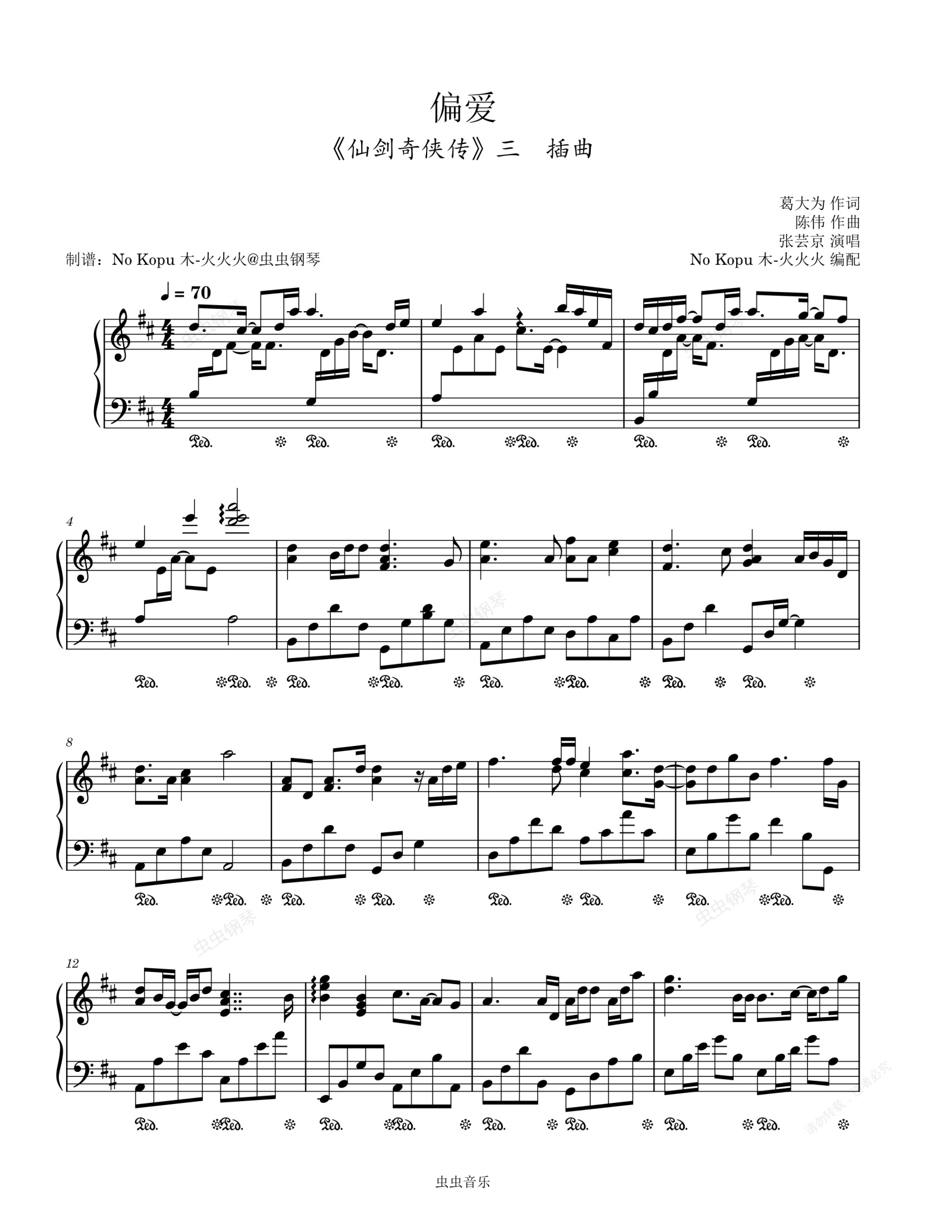钢琴谱:D调《偏爱》纯钢琴伴奏弹唱谱
