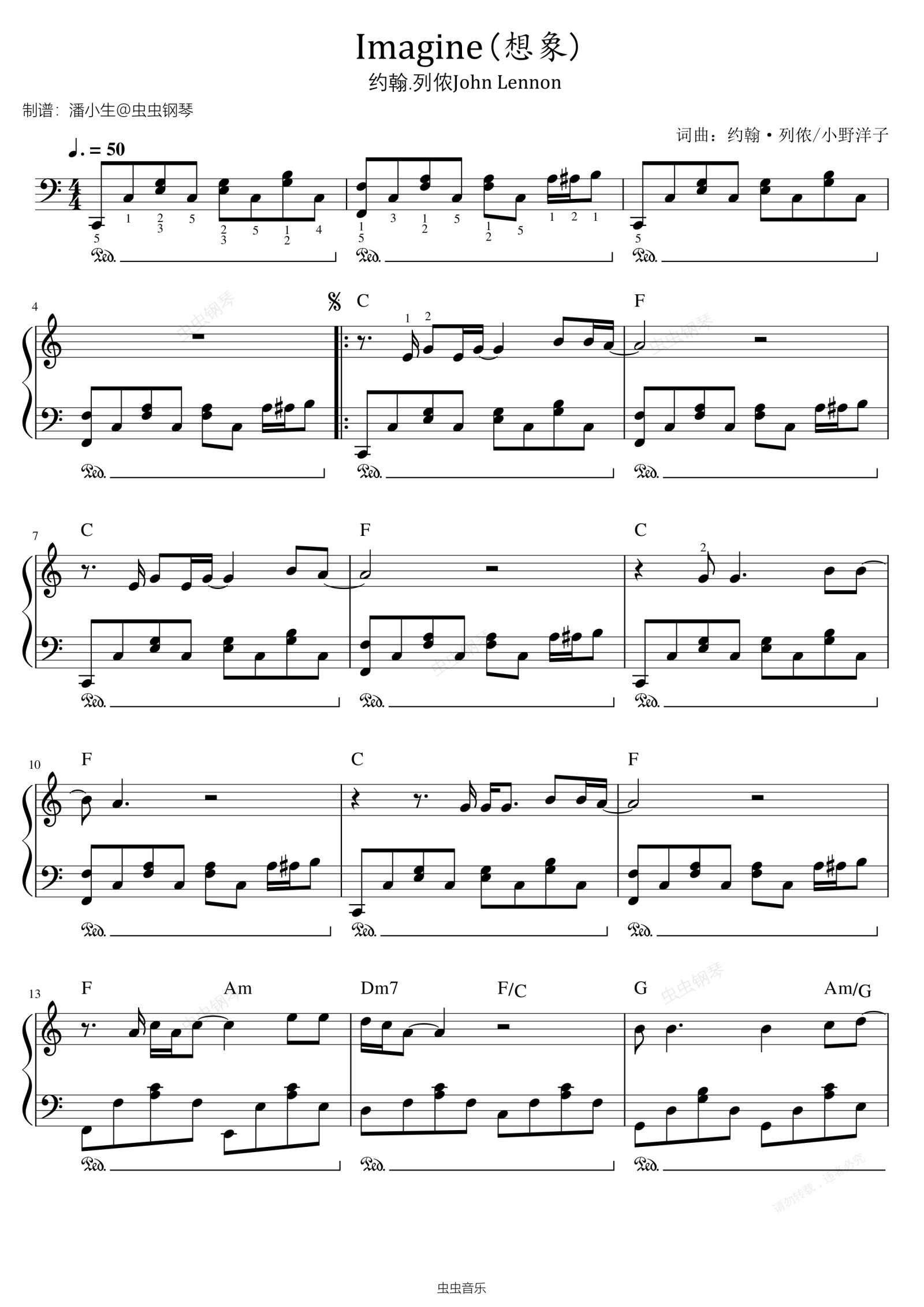 钢琴谱:Imagine(想象) 约翰.列侬 John Lennon 原调标准易弹版 带和弦标记