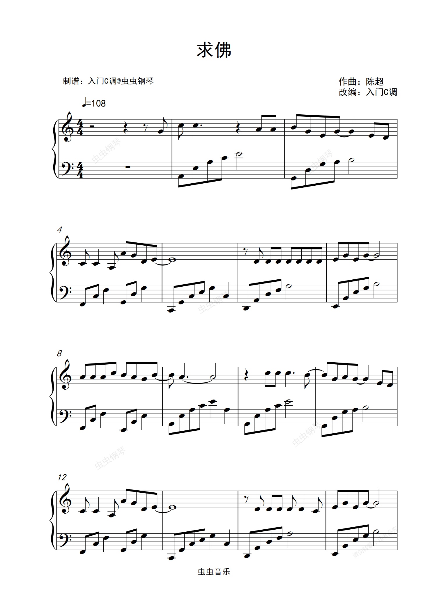 钢琴谱:【经典老歌】誓言《求佛》入门C调简单版