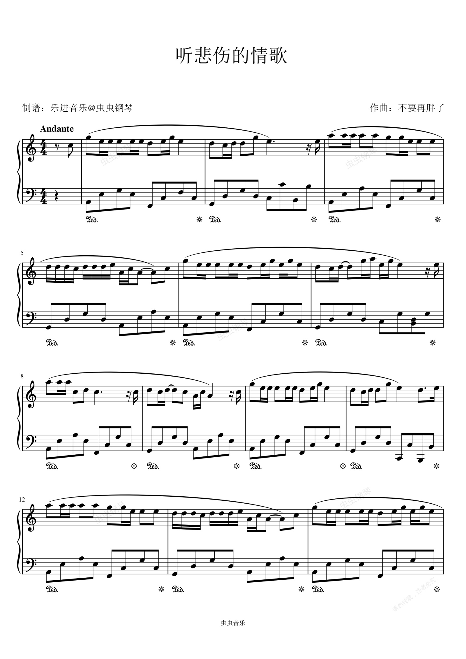 钢琴谱:《听悲伤的情歌》C调独奏简易版