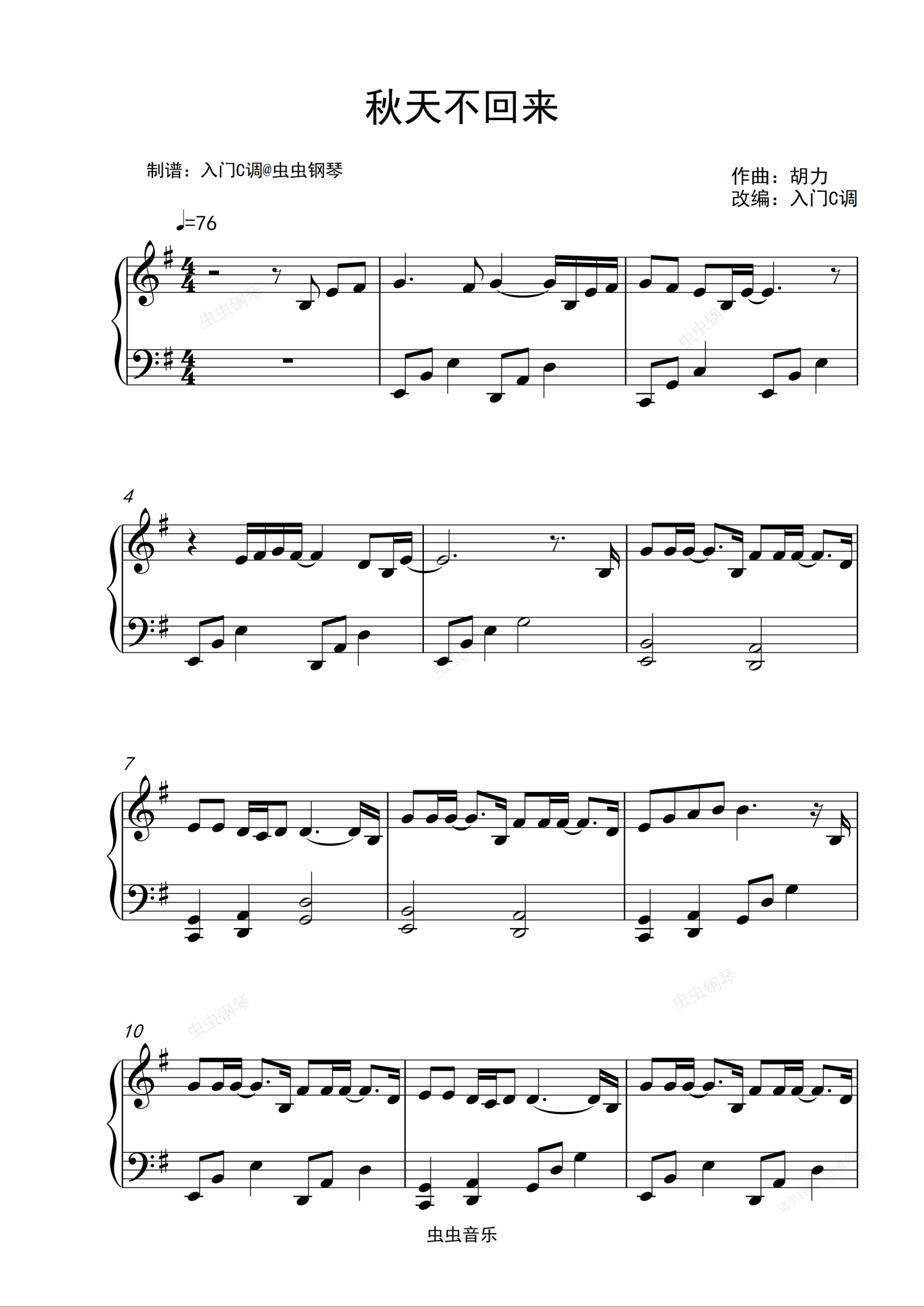 钢琴谱:【经典老歌】王强《秋天不回来》G调简单版