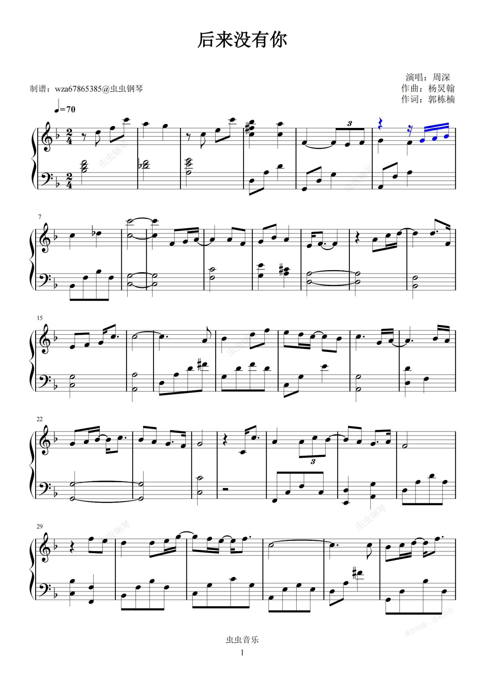 钢琴谱:后来没有你