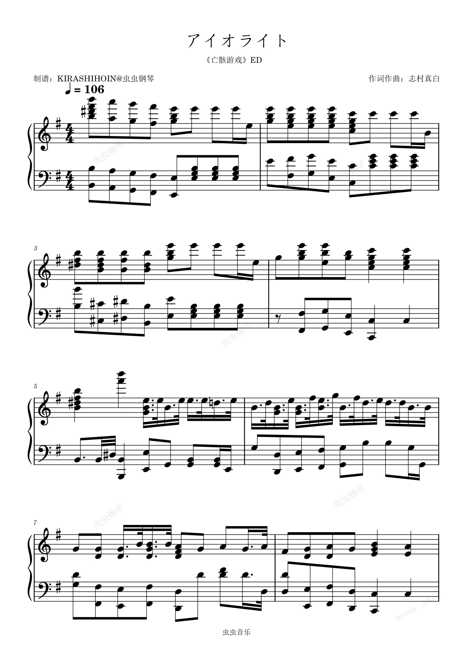 钢琴谱:アイオライト(《亡骸游戏》ED/片尾曲)- 水濑祈