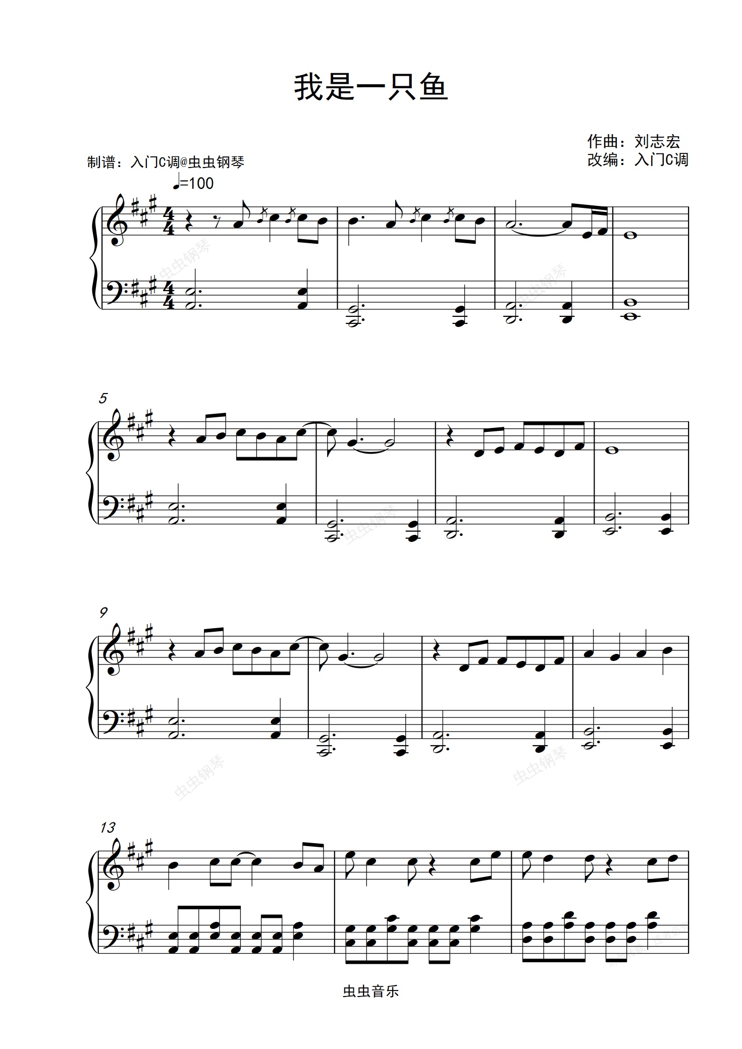 钢琴谱:【经典老歌】任贤齐《我是一只鱼》原A调转B调简单版