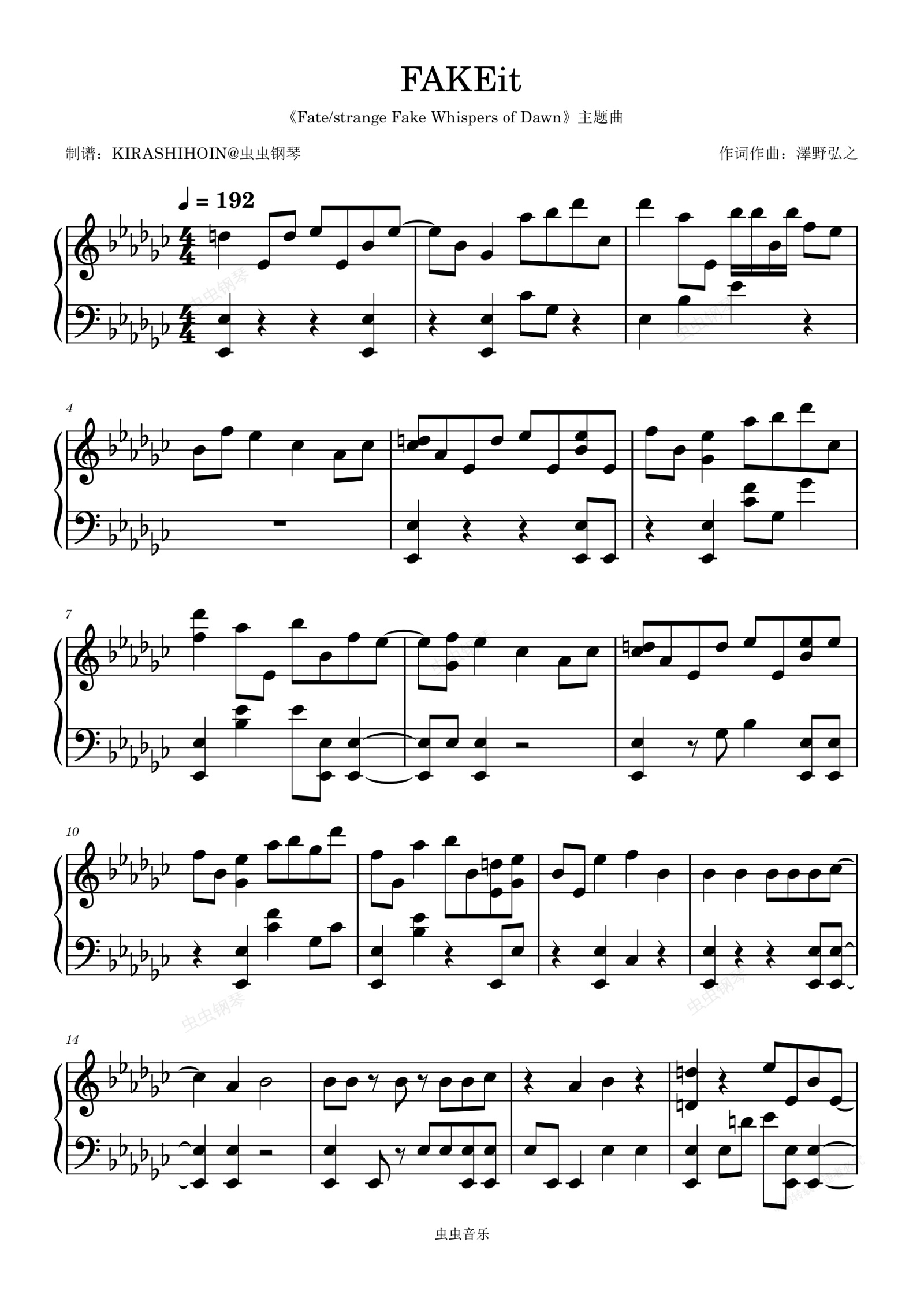 钢琴谱:FAKEit(《Fate/strange Fake Whispers of Dawn》主题曲)- 泽野弘之