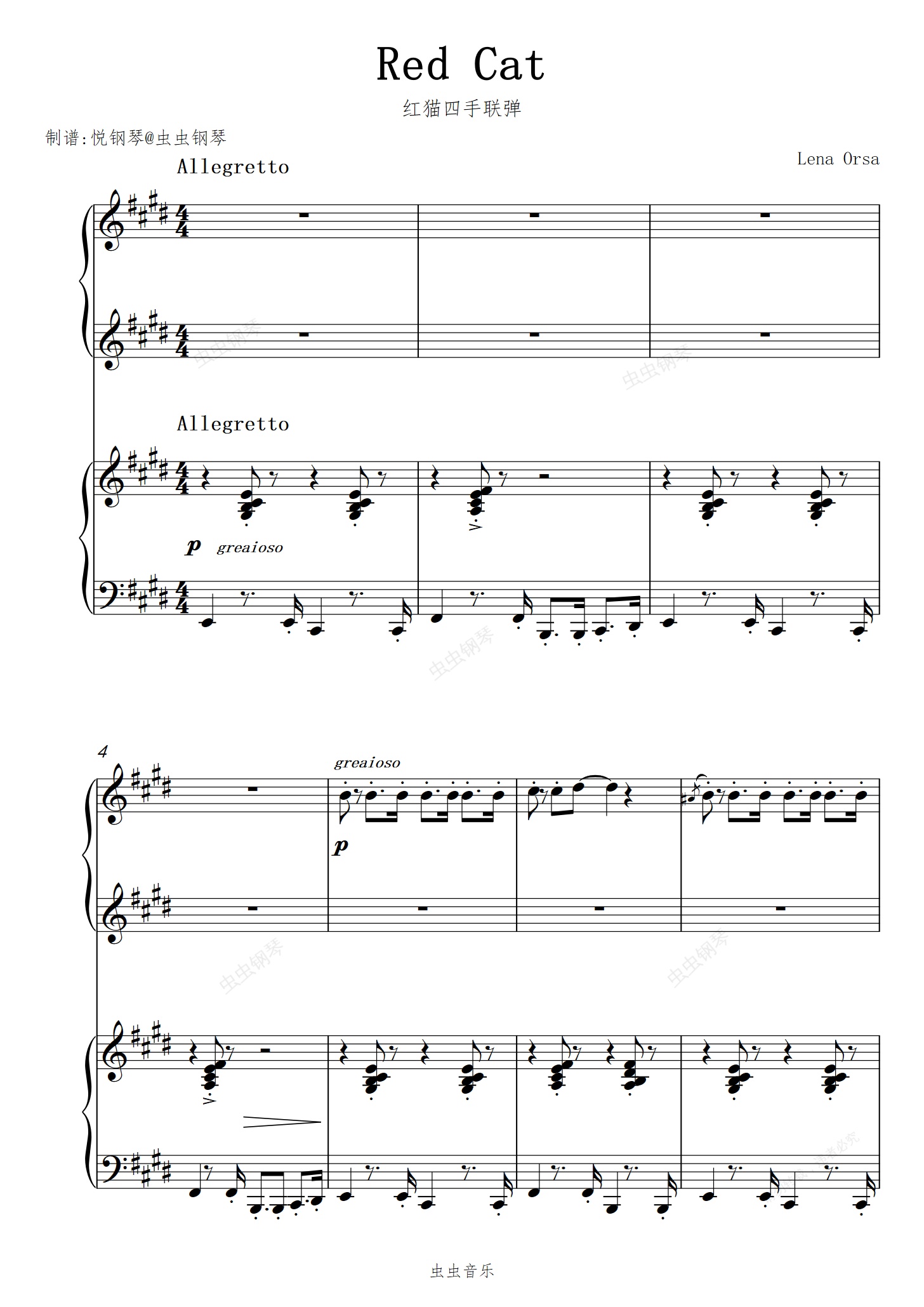 钢琴谱:红猫 四手联弹//Red Cat【爵士四手联弹】