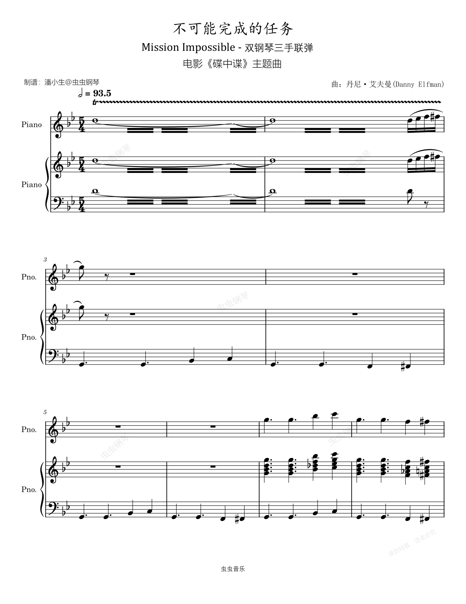 钢琴谱:Mission Impossible 双钢琴三手联弹 不可能完成的任务 电影《碟中谍》主题音乐