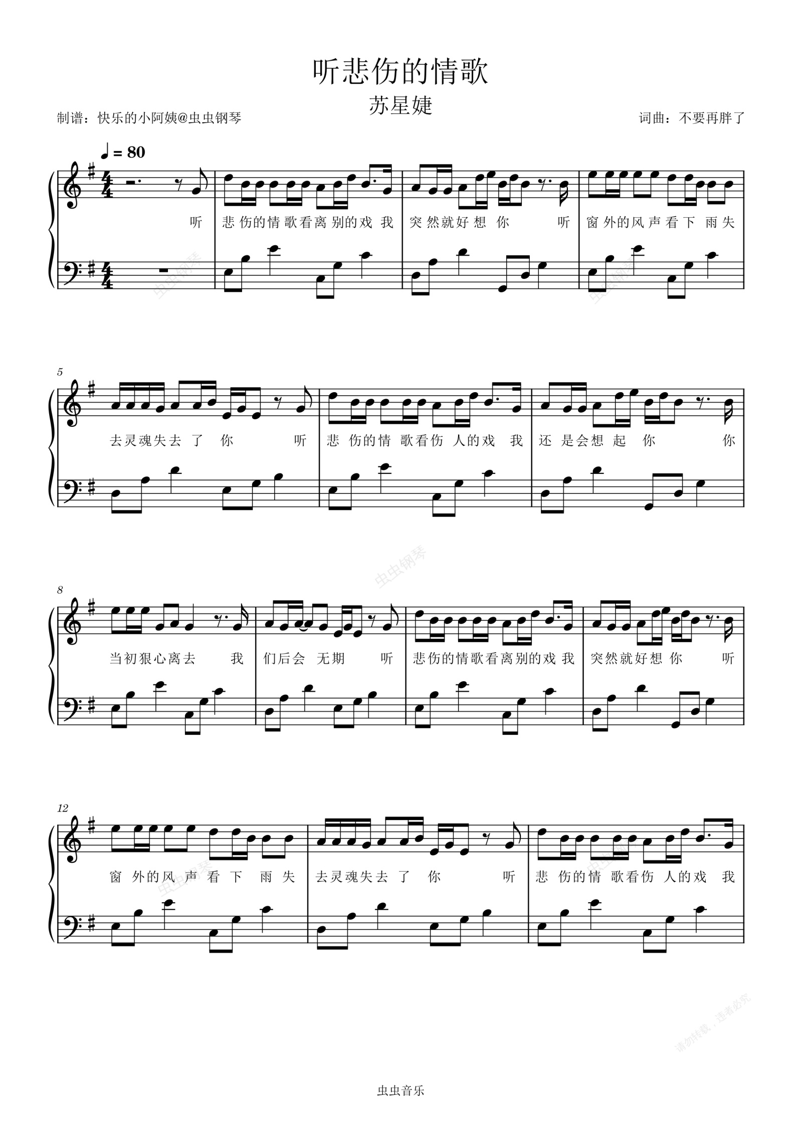 钢琴谱:听悲伤的情歌-苏星婕-原调带歌词
