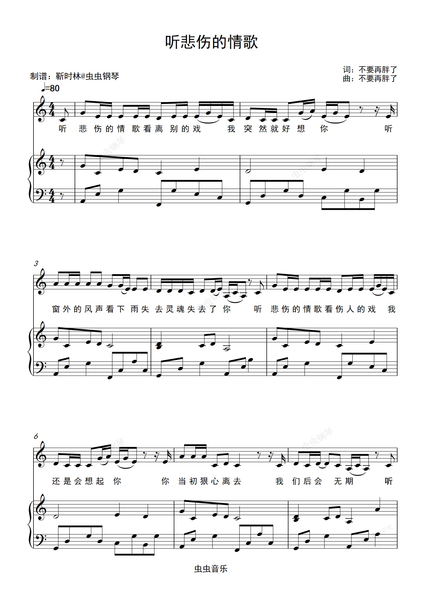 钢琴谱:《听悲伤的情歌》a调弹唱谱带歌词