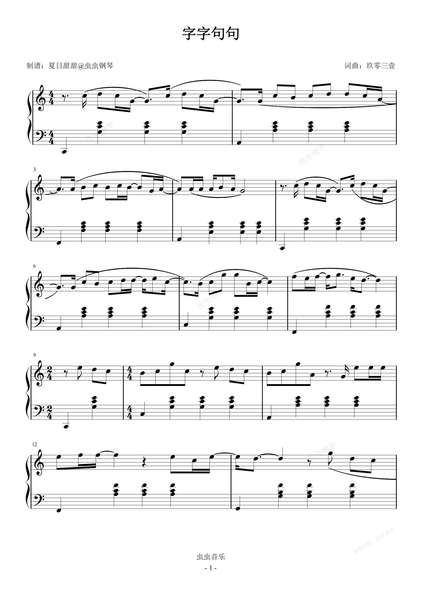 钢琴谱:字字句句C调简易 张碧晨 王赫野