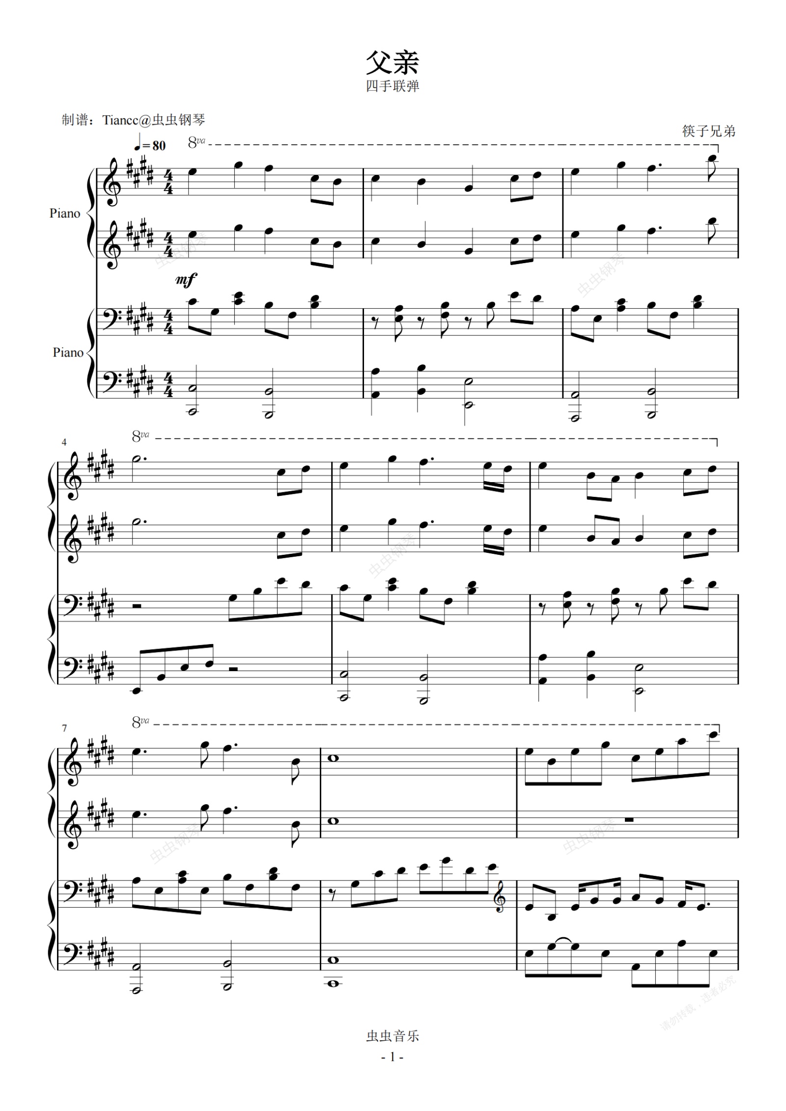 钢琴谱:《父亲》四手联弹,父亲节快乐