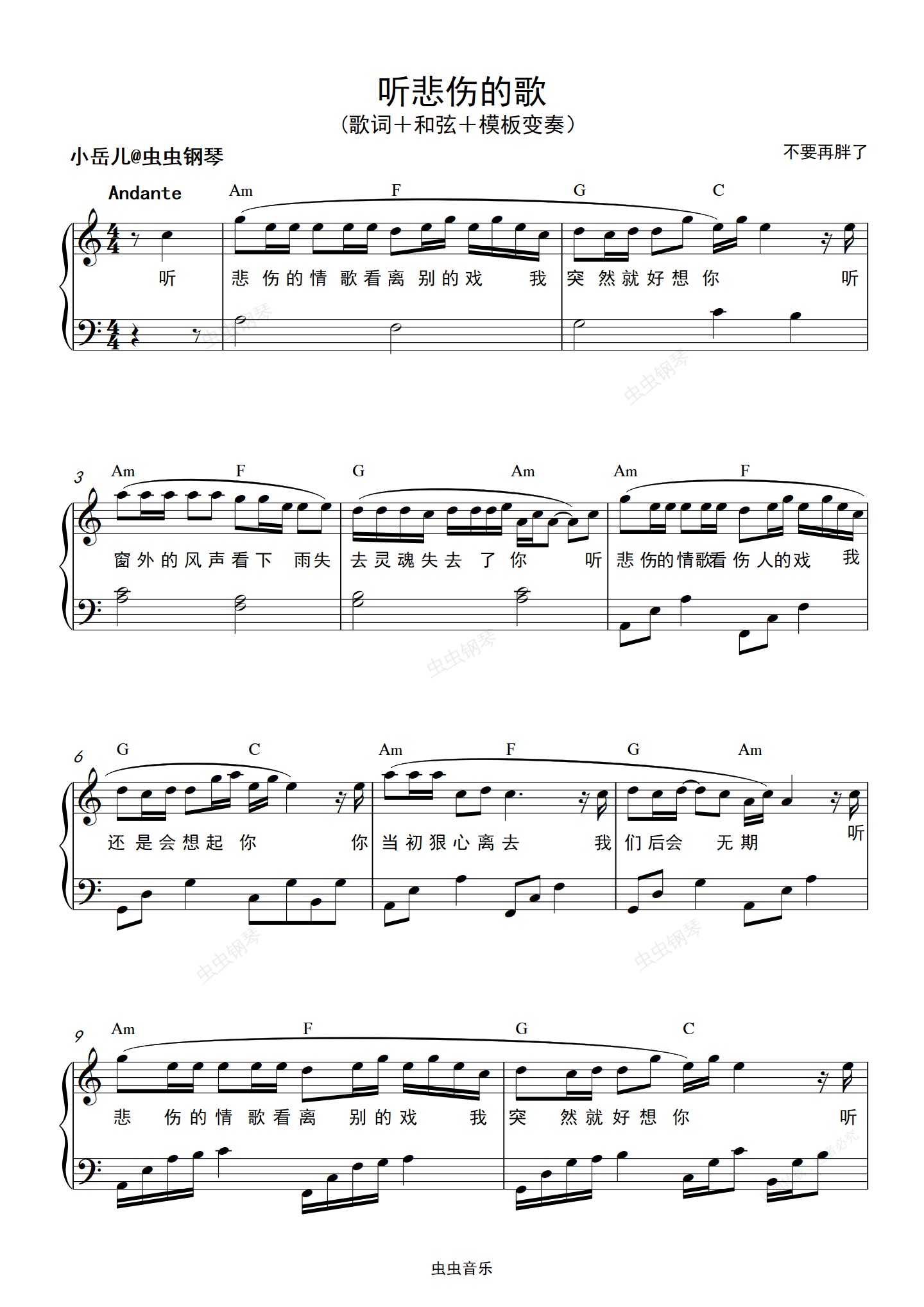 钢琴谱:听悲伤的歌(好听好弹)歌词+和弦