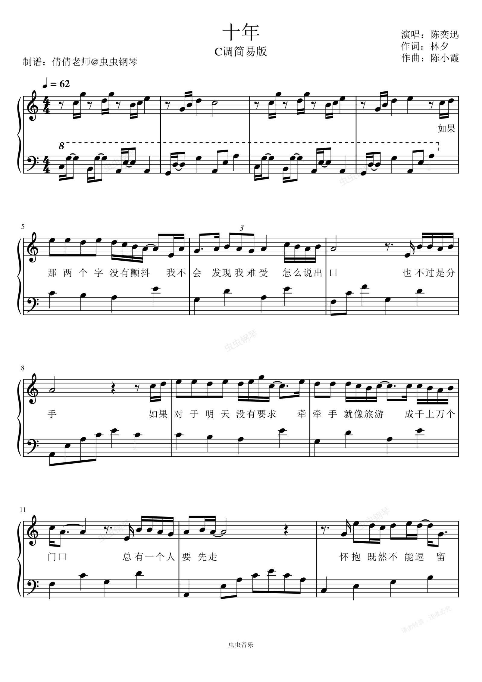 钢琴谱:十年-C调完整简单易曲-陈奕迅
