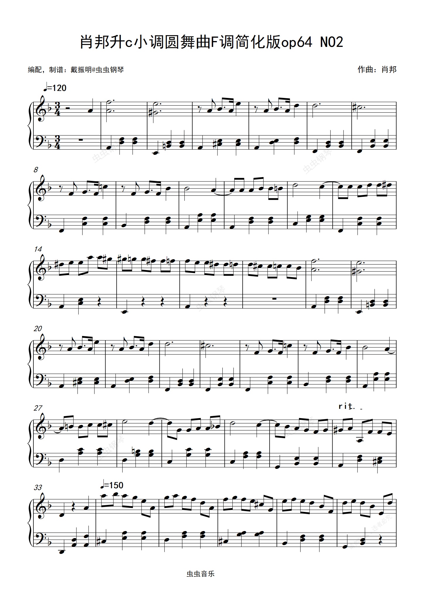 钢琴谱:肖邦升c小调调圆舞曲F调简化版op64 NO2