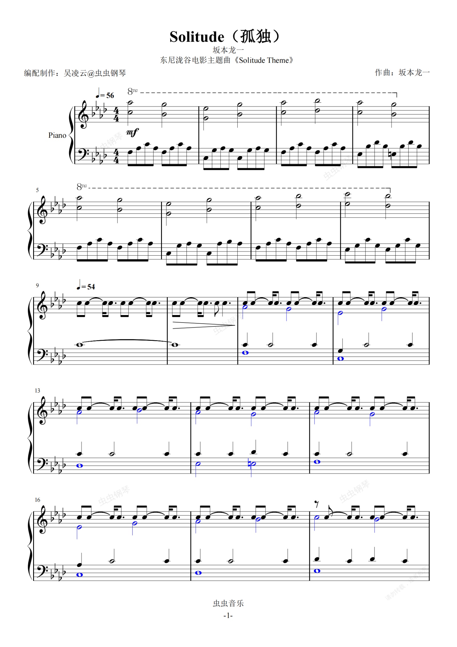 钢琴谱:Solitude(孤独) 坂本龙一  东尼泷谷电影主题曲《Solitude Theme》