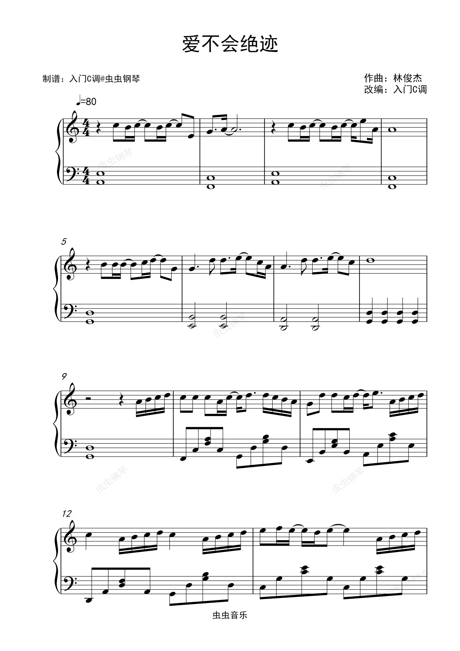 钢琴谱:【90后记忆】林俊杰《爱不会绝迹》入门C调简单版