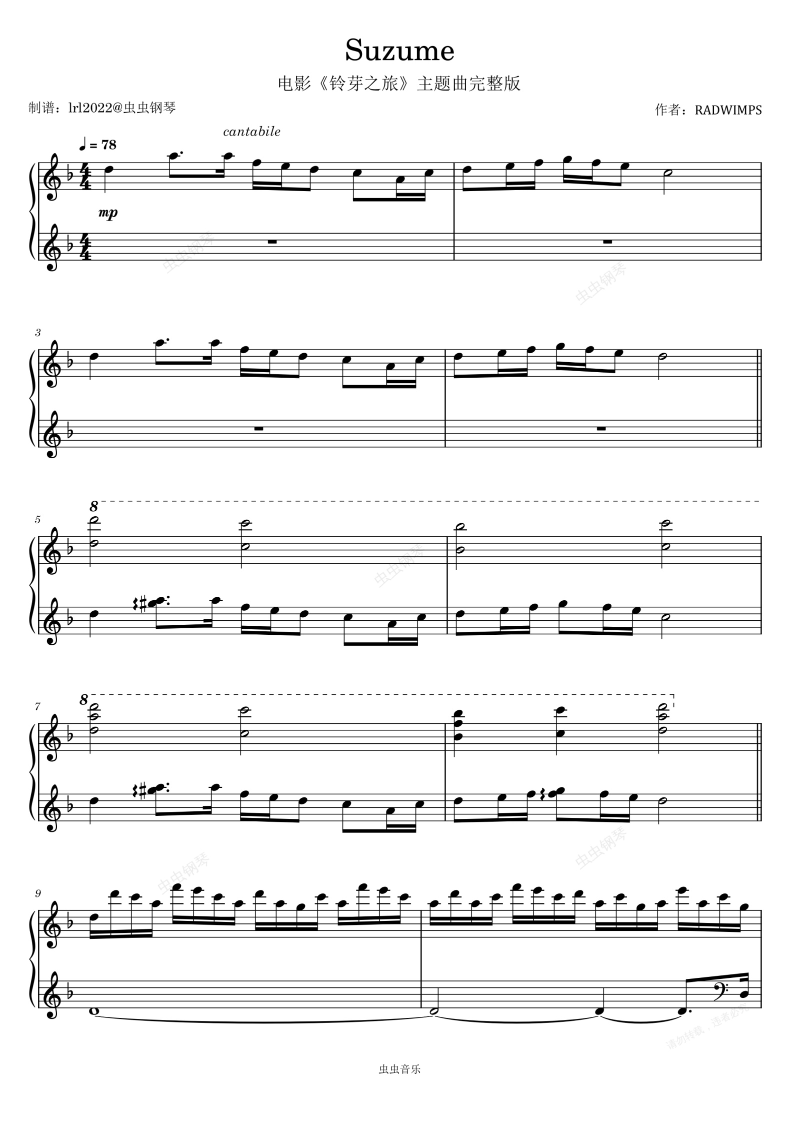钢琴谱:Suzume - 电影《铃芽之旅》主题曲 - 钢琴独奏 完整版