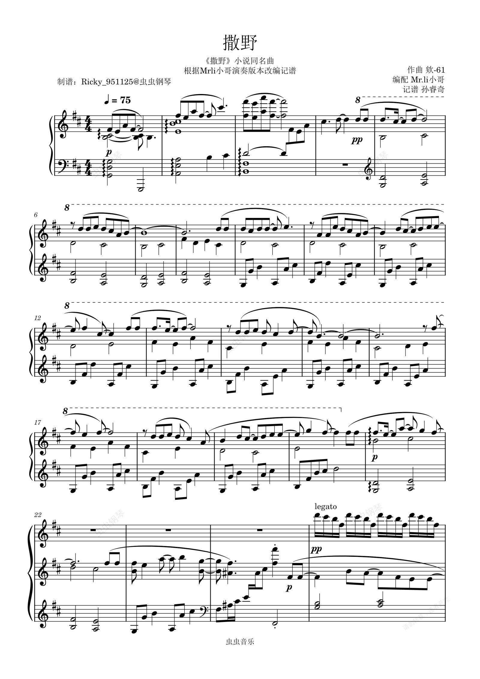 钢琴谱:撒野——完美独奏版