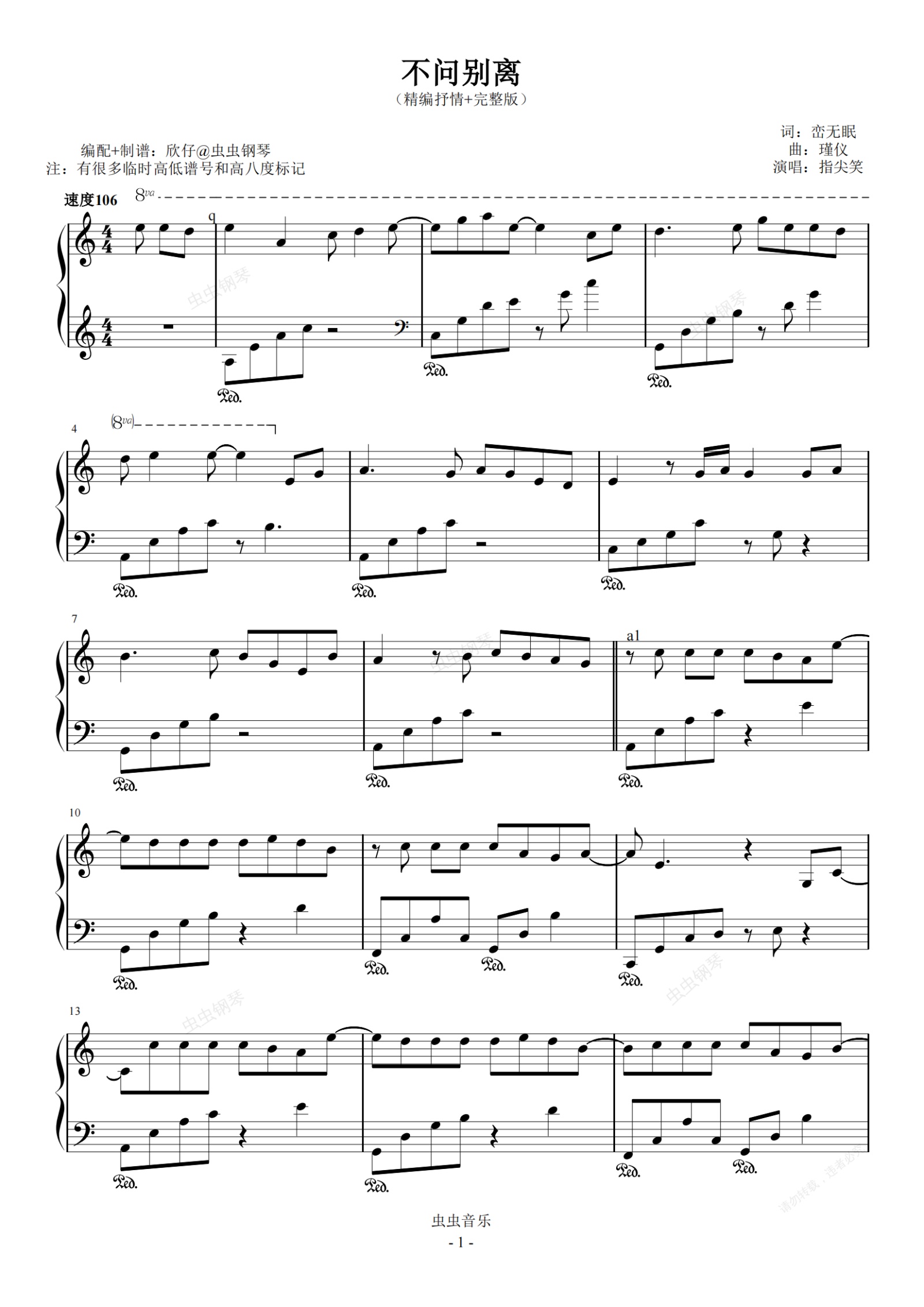 钢琴谱:指尖笑-a《不问别离》(精编抒情+完整版)