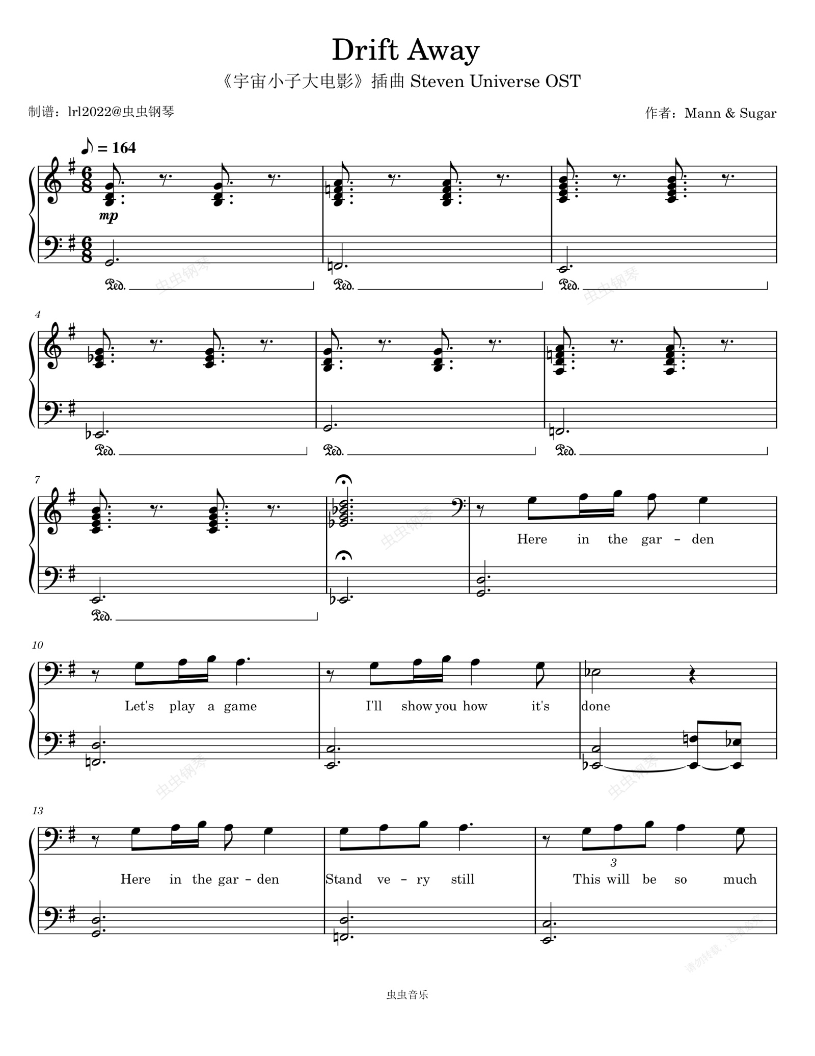钢琴谱:Drift Away -《宇宙小子大电影》插曲 - 钢琴独奏加歌词 - Steven Universe