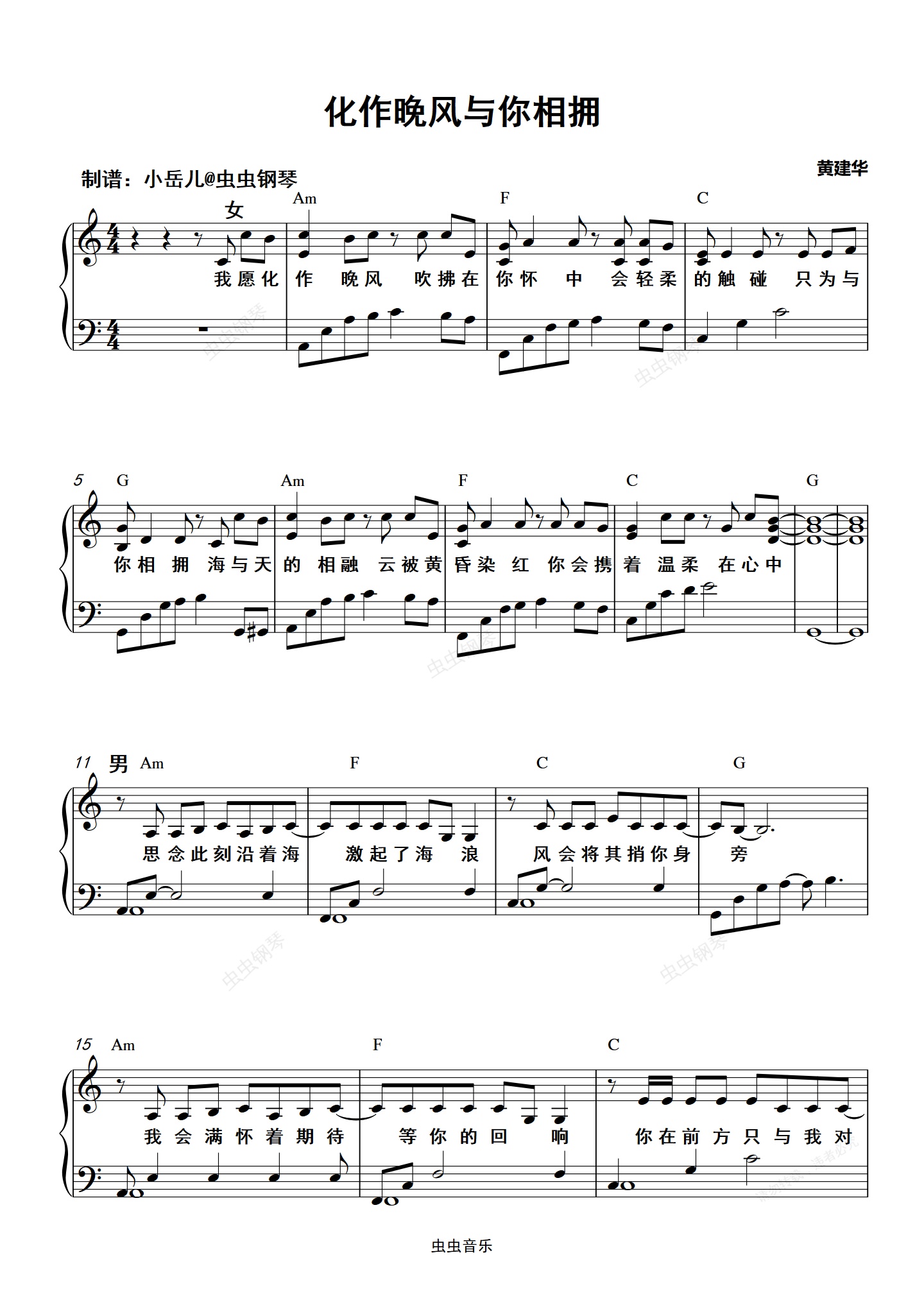 钢琴谱:化作晚风与你相拥(C调) - 尹昔眠