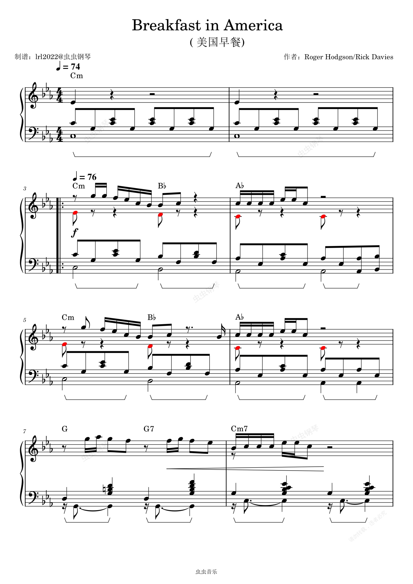 钢琴谱:Breakfast in america - ( 美国早餐) - Supertramp - 钢琴独奏 - 带和弦标记