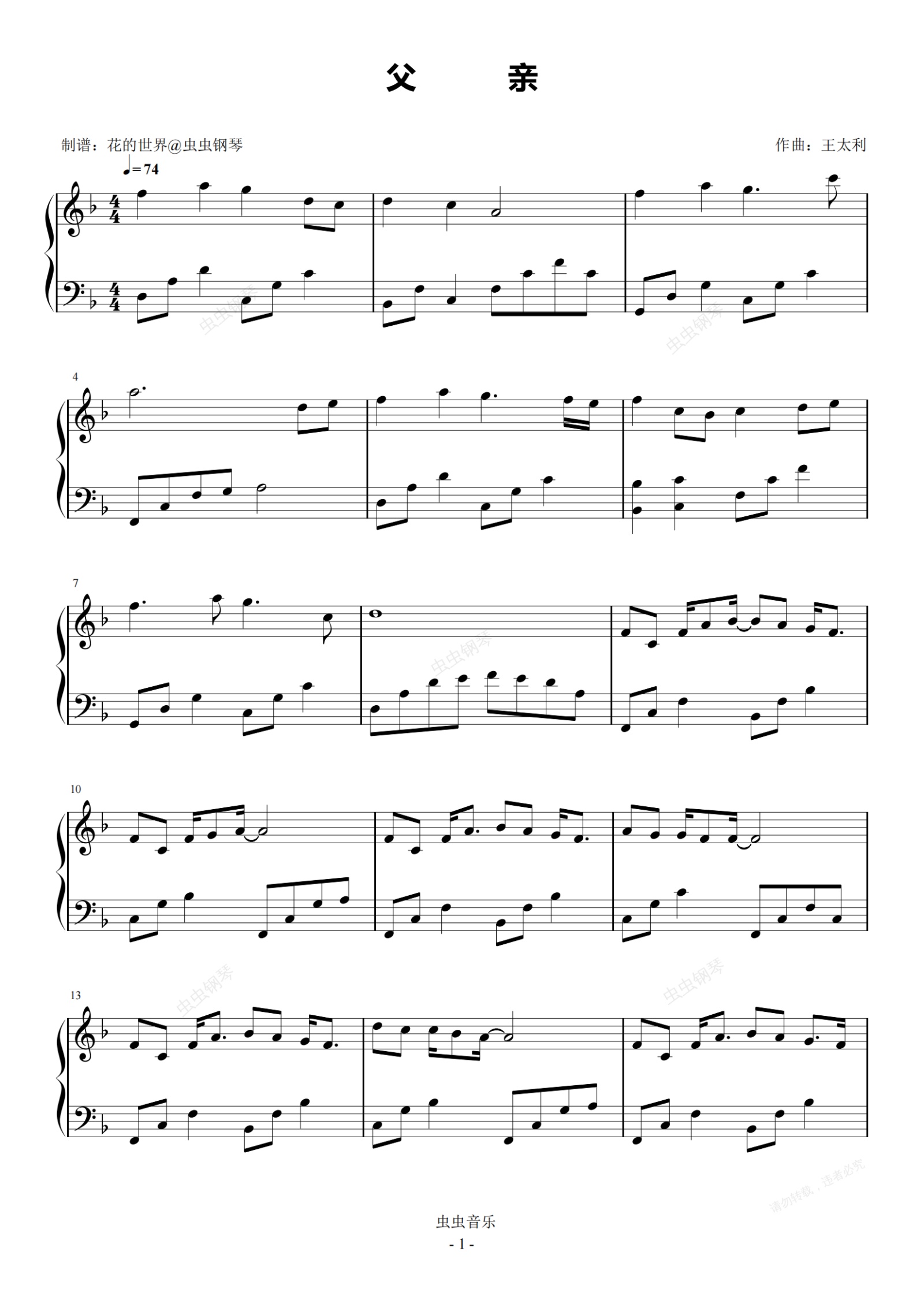 钢琴谱:父亲 原调简易版