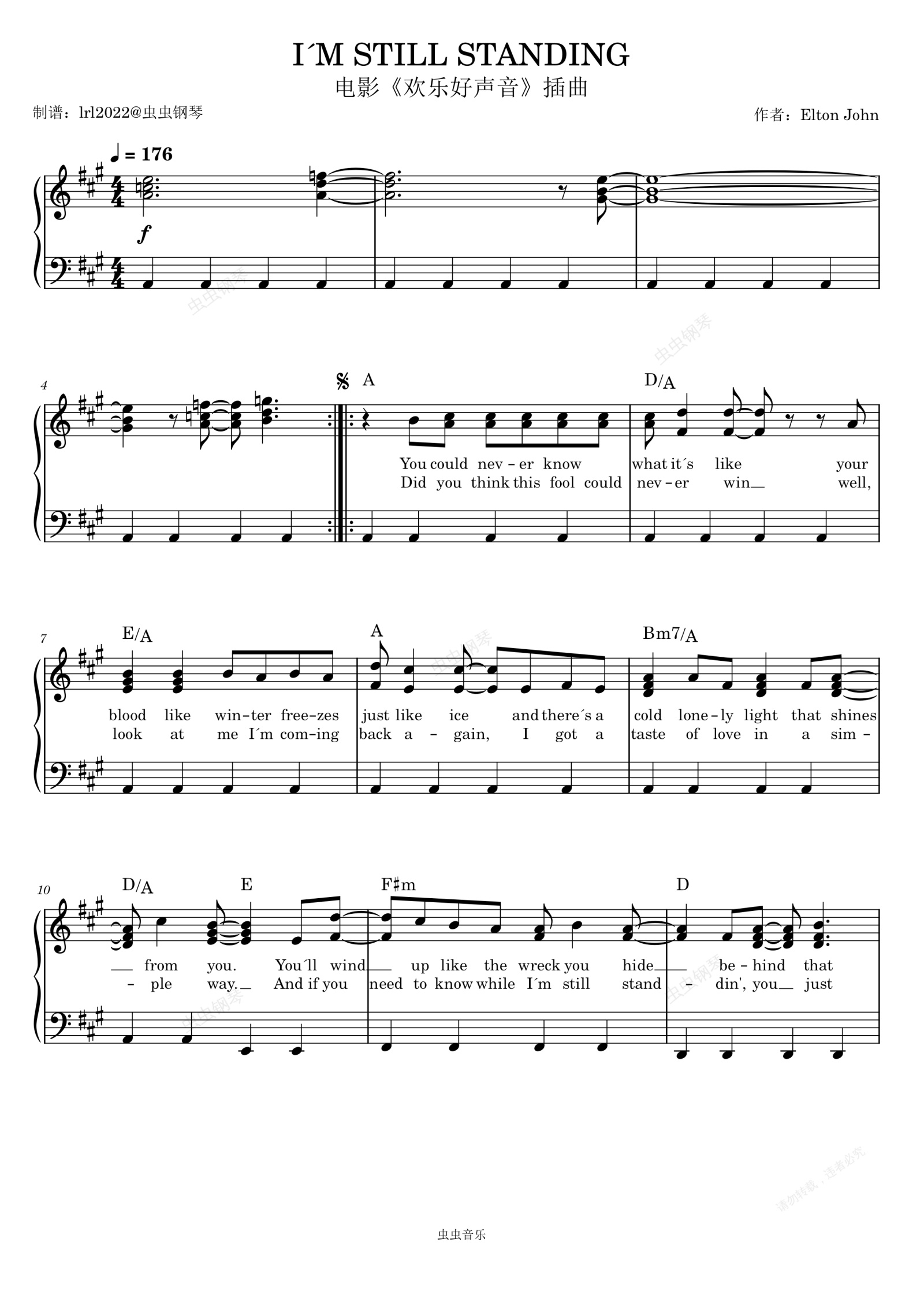 钢琴谱:Im still standing - 电影《欢乐好声音》插曲 - 独奏带歌词和弦标记