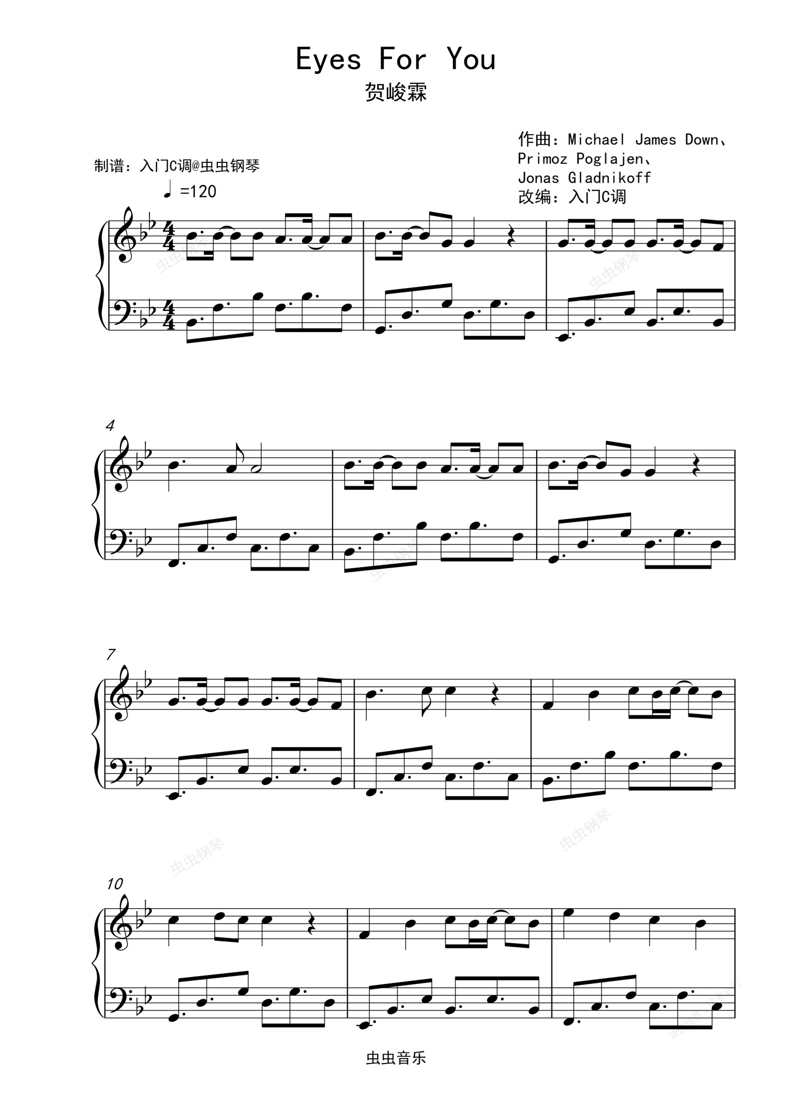 钢琴谱:贺峻霖 《Eyes For You》原调简单版