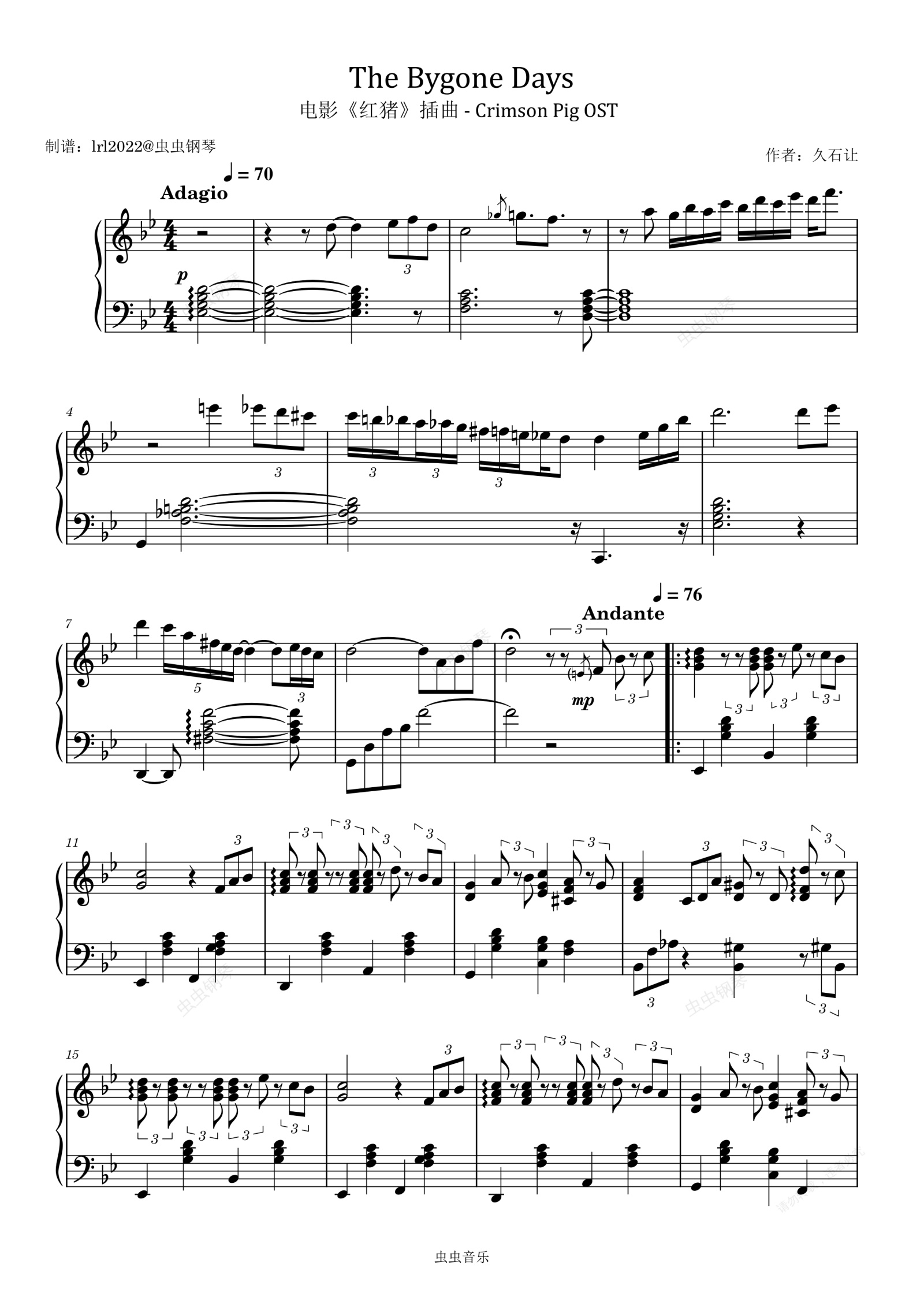 钢琴谱:The Bygone Days - 电影《红猪》插曲 - 久石让 - 钢琴独奏