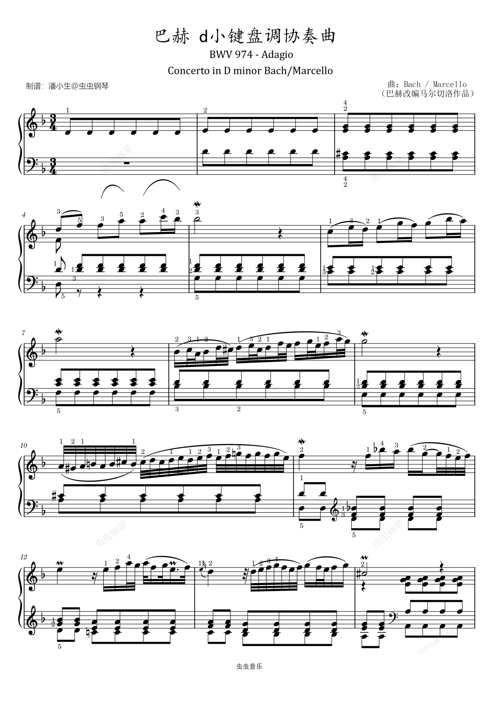钢琴谱:巴赫 d小调键盘协奏曲 原版带指法 Concerto in D minor Adagio BWV 974 钢琴独奏