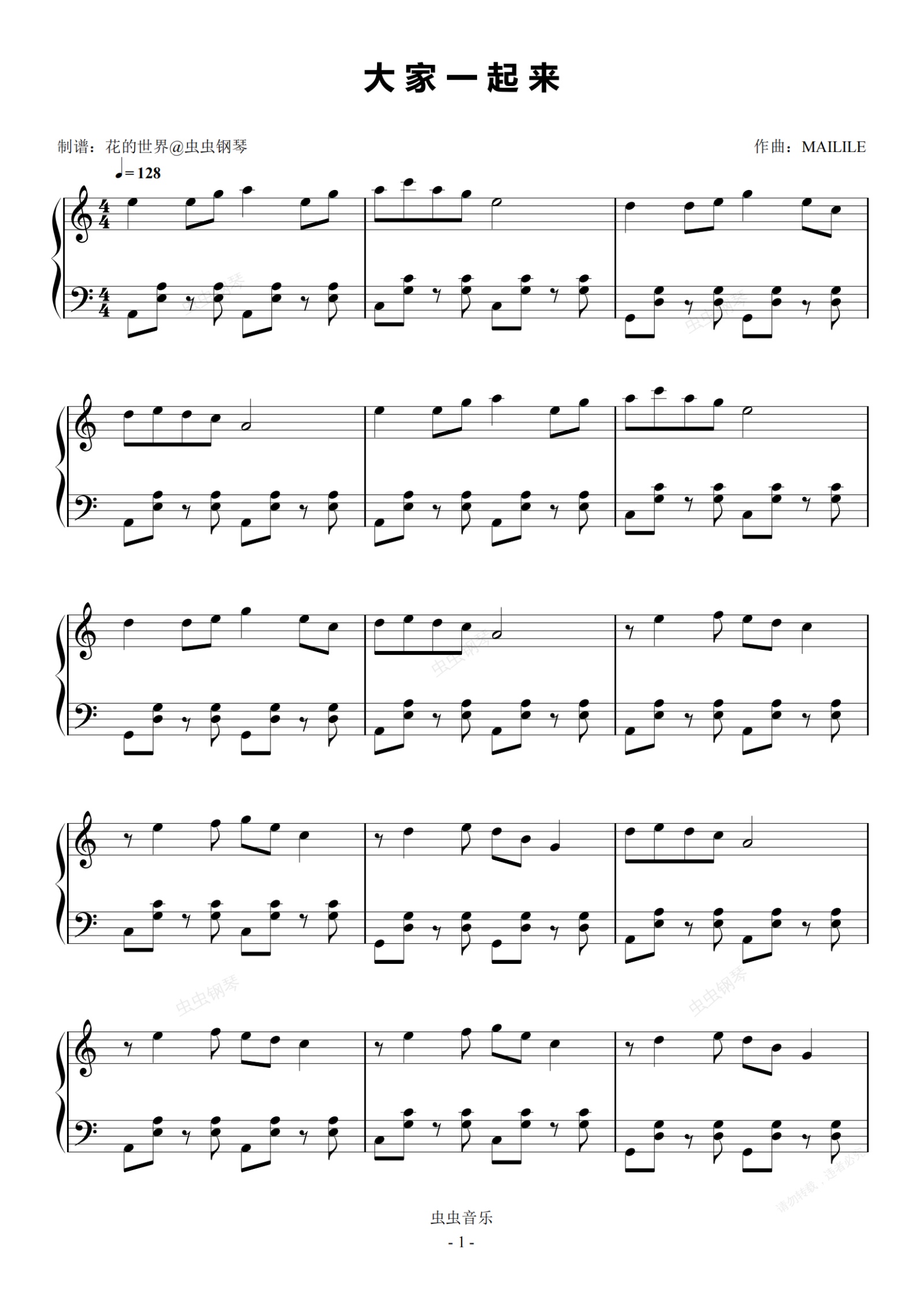 钢琴谱:大家一起来 C调简易版 孙悦