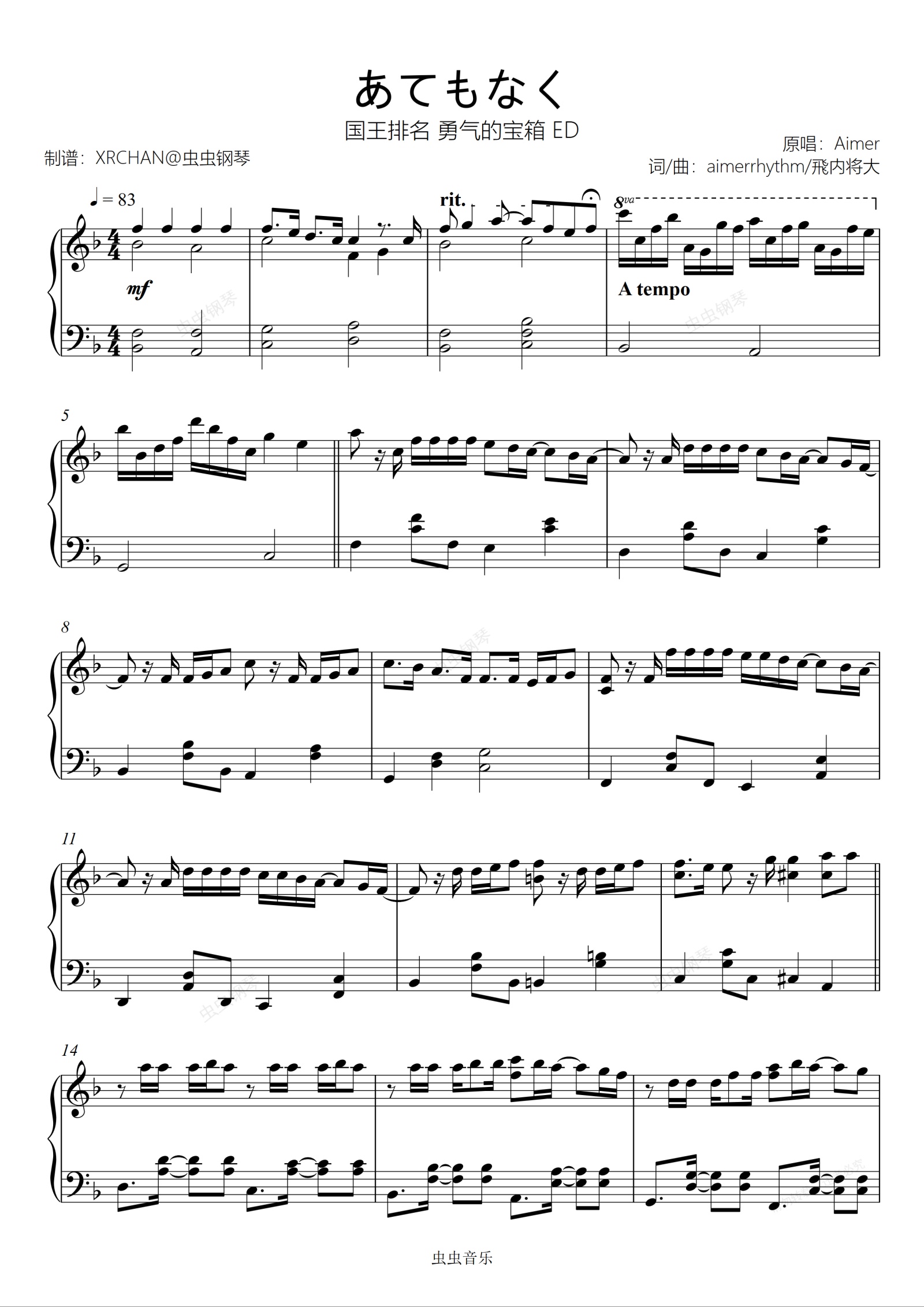 钢琴谱:あてもなく 《国王排名 勇气的宝箱》 ED 初级