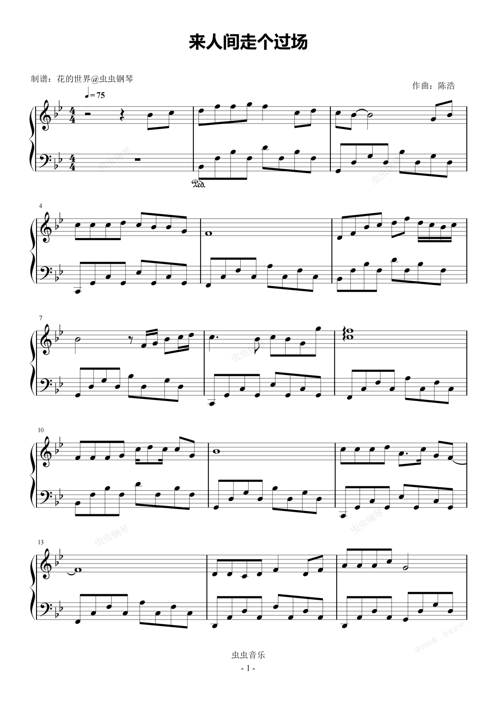 钢琴谱:来人间走个过场 原调简易版  王超然