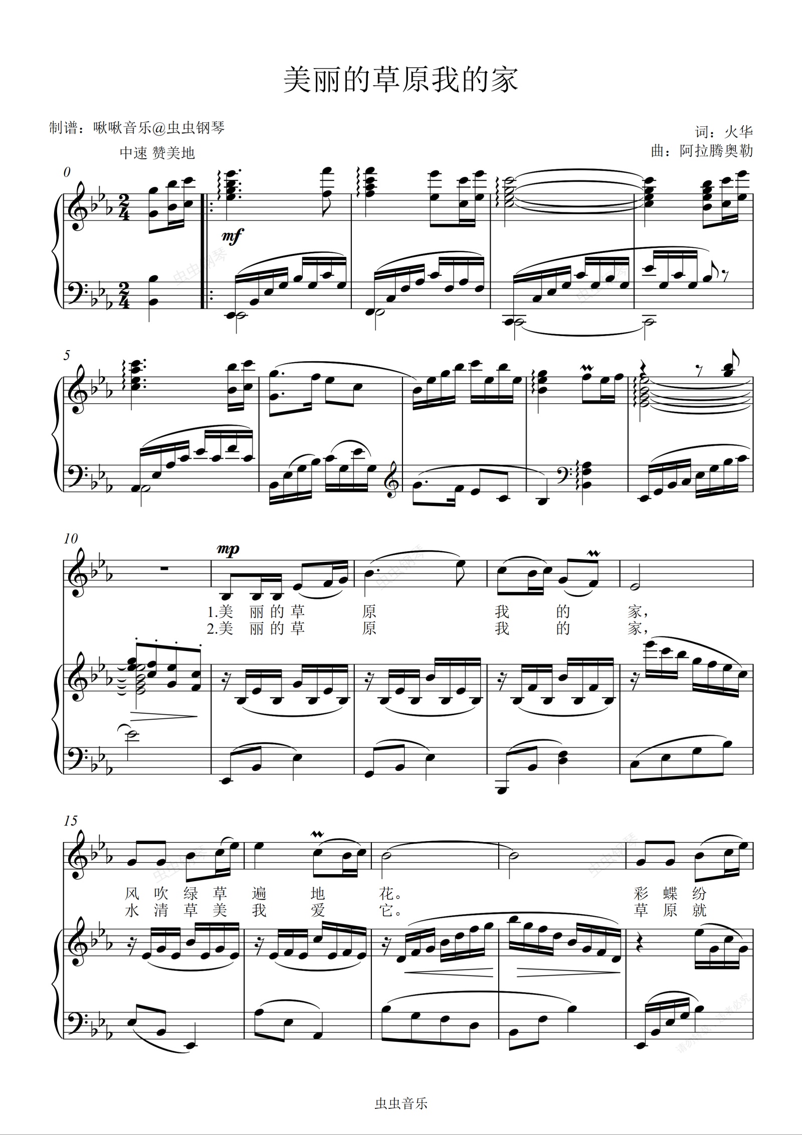 钢琴谱:美丽的草原我的家 钢琴弹唱伴奏谱 降E调