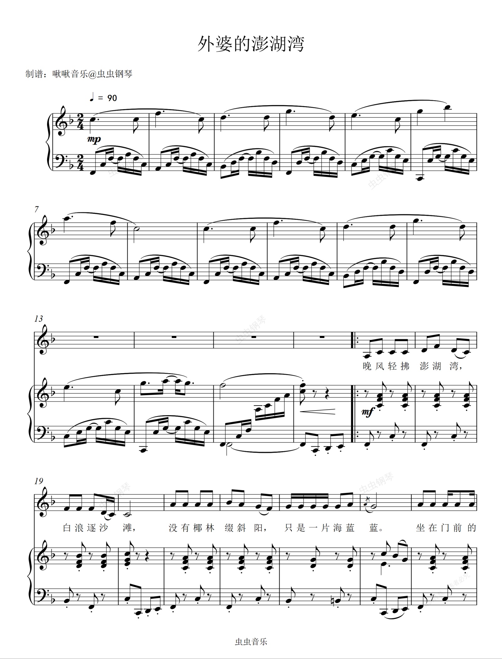 钢琴谱:外婆的澎湖湾 钢琴弹唱伴奏谱