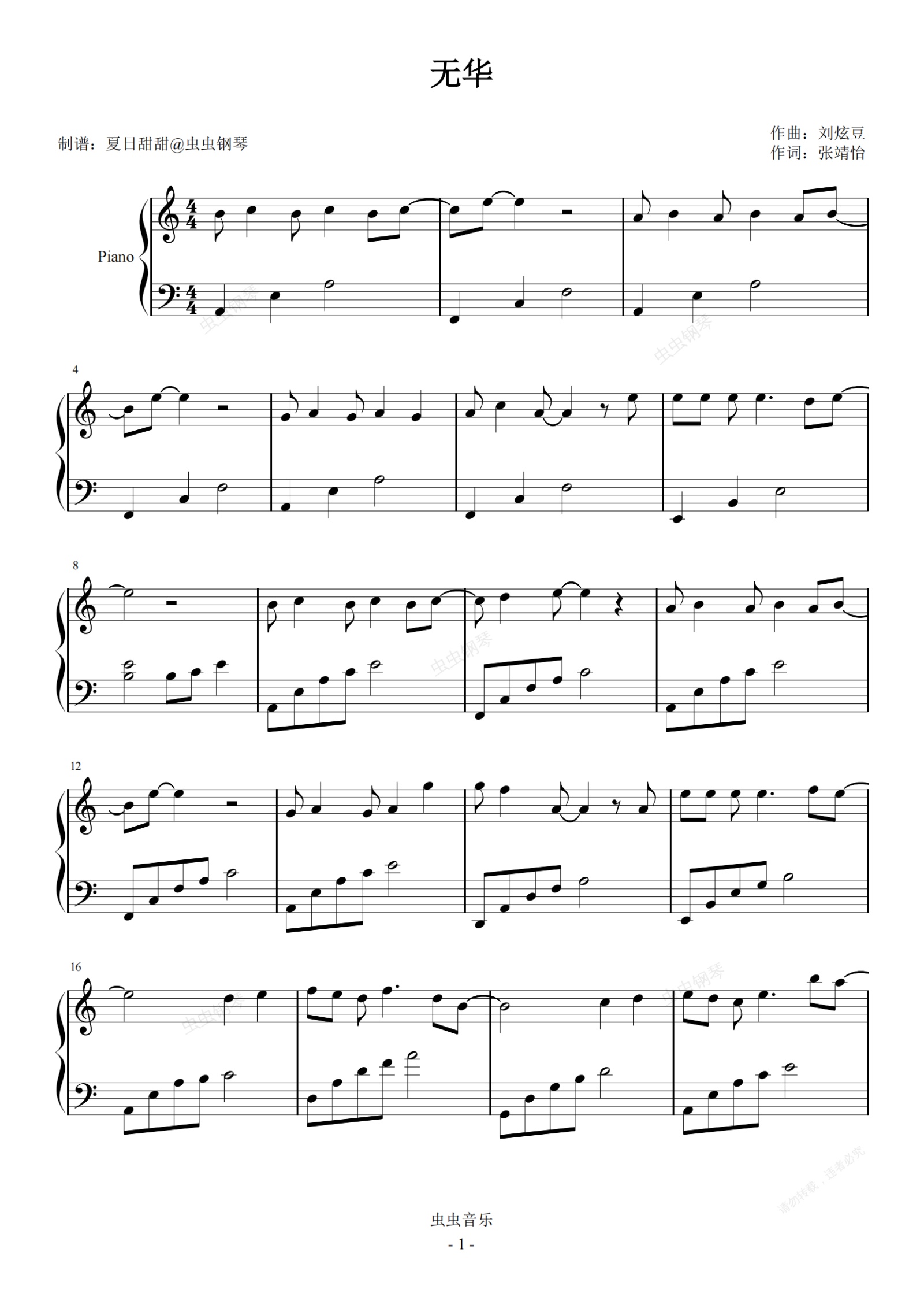 钢琴谱:无华C调简易 张靓颖、刘宇宁