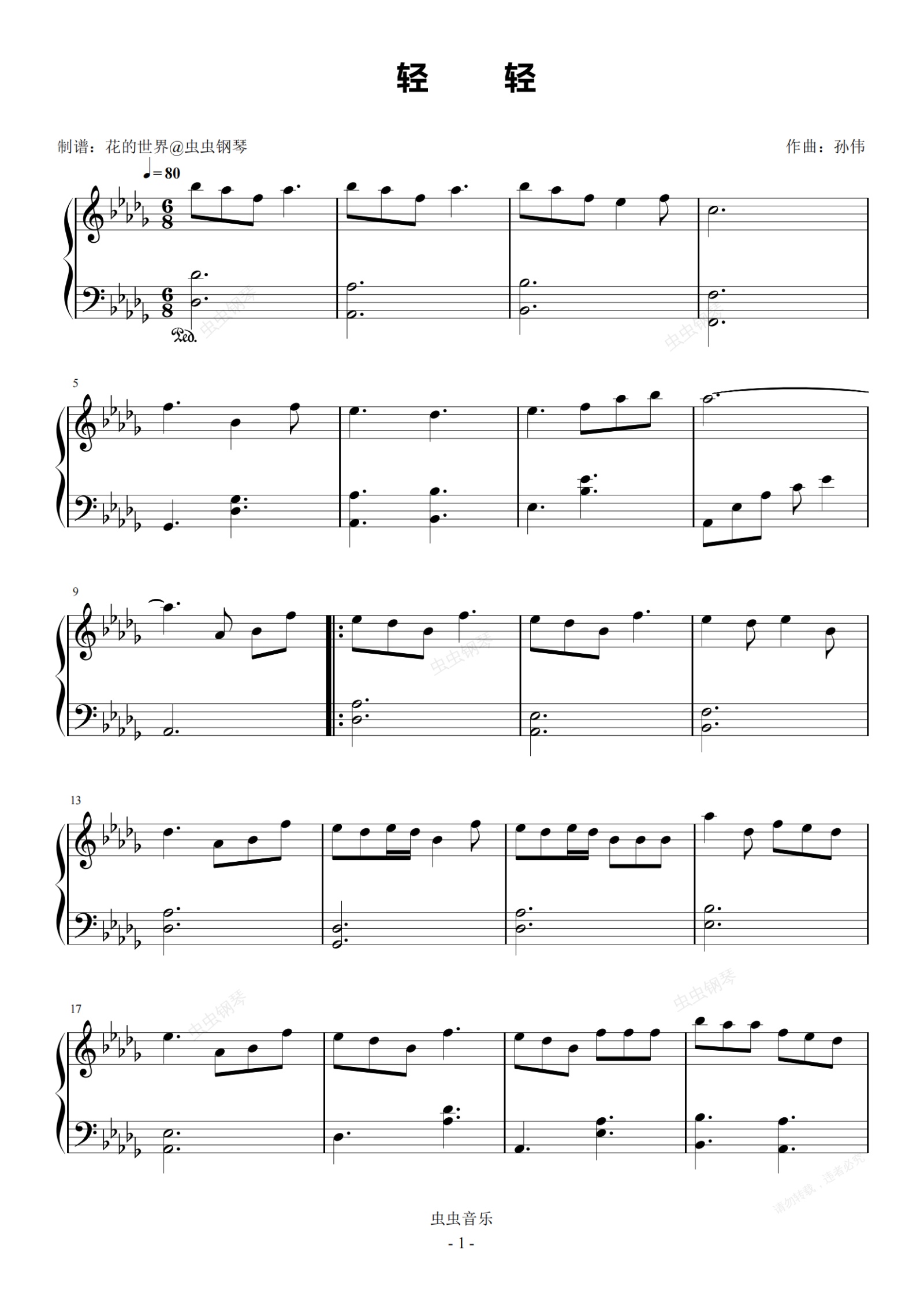 钢琴谱:轻轻 原调简易版 张靓颖