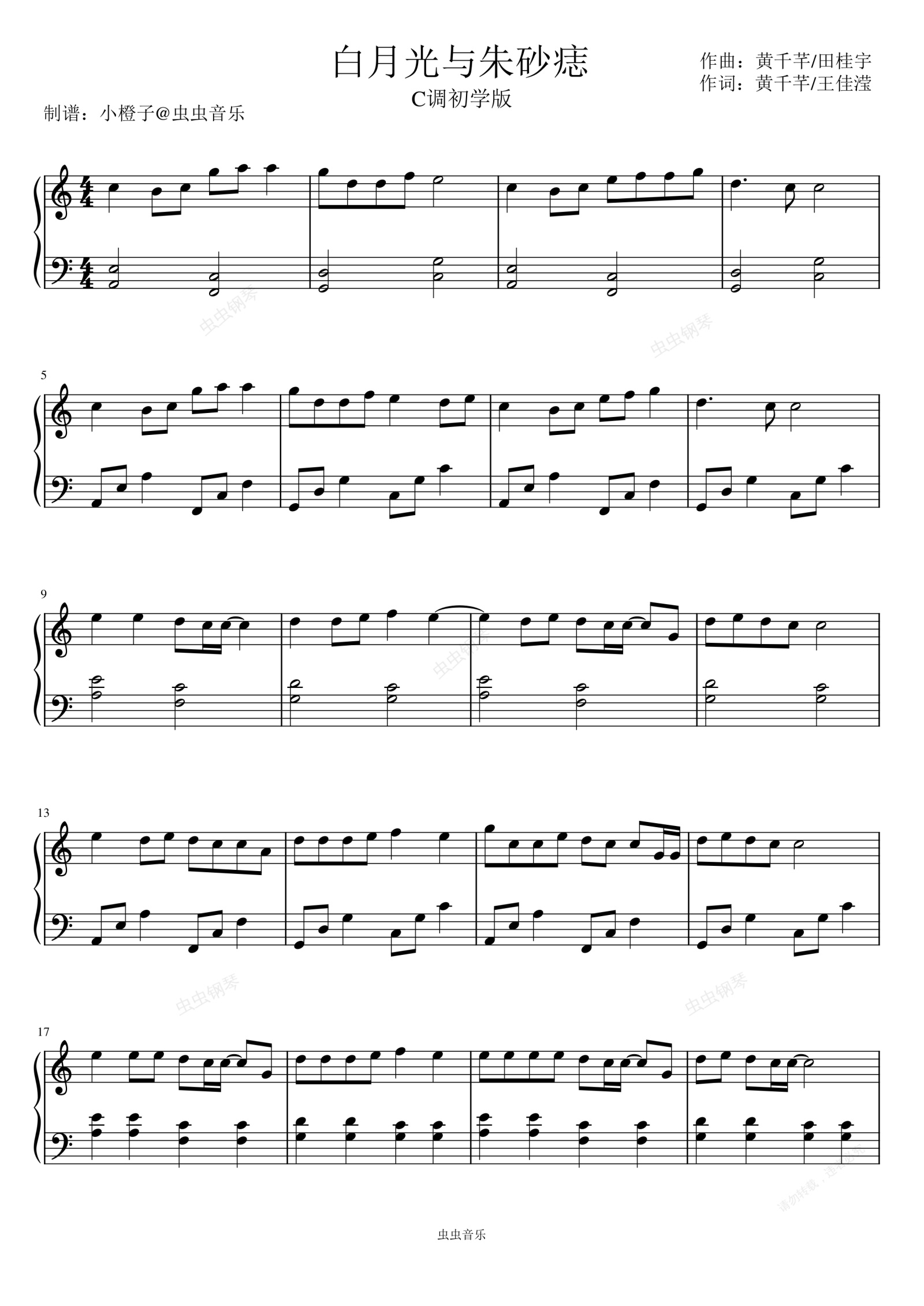 钢琴谱:⟪白月光与朱砂痣⟫ C调巨简单版+初学拜厄难度