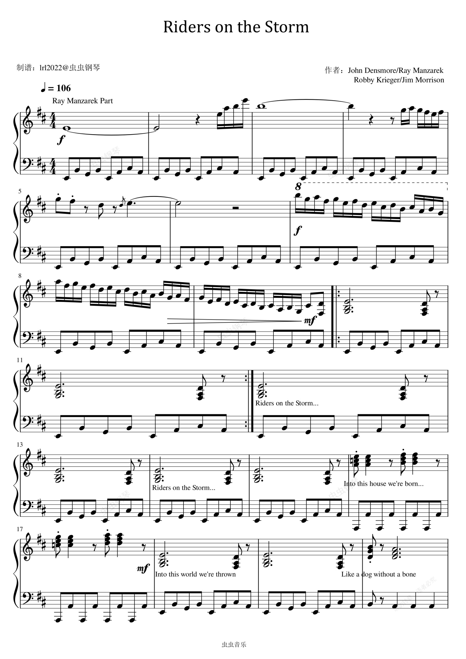钢琴谱:Riders on the Storm - The Doors - 钢琴伴奏加歌词