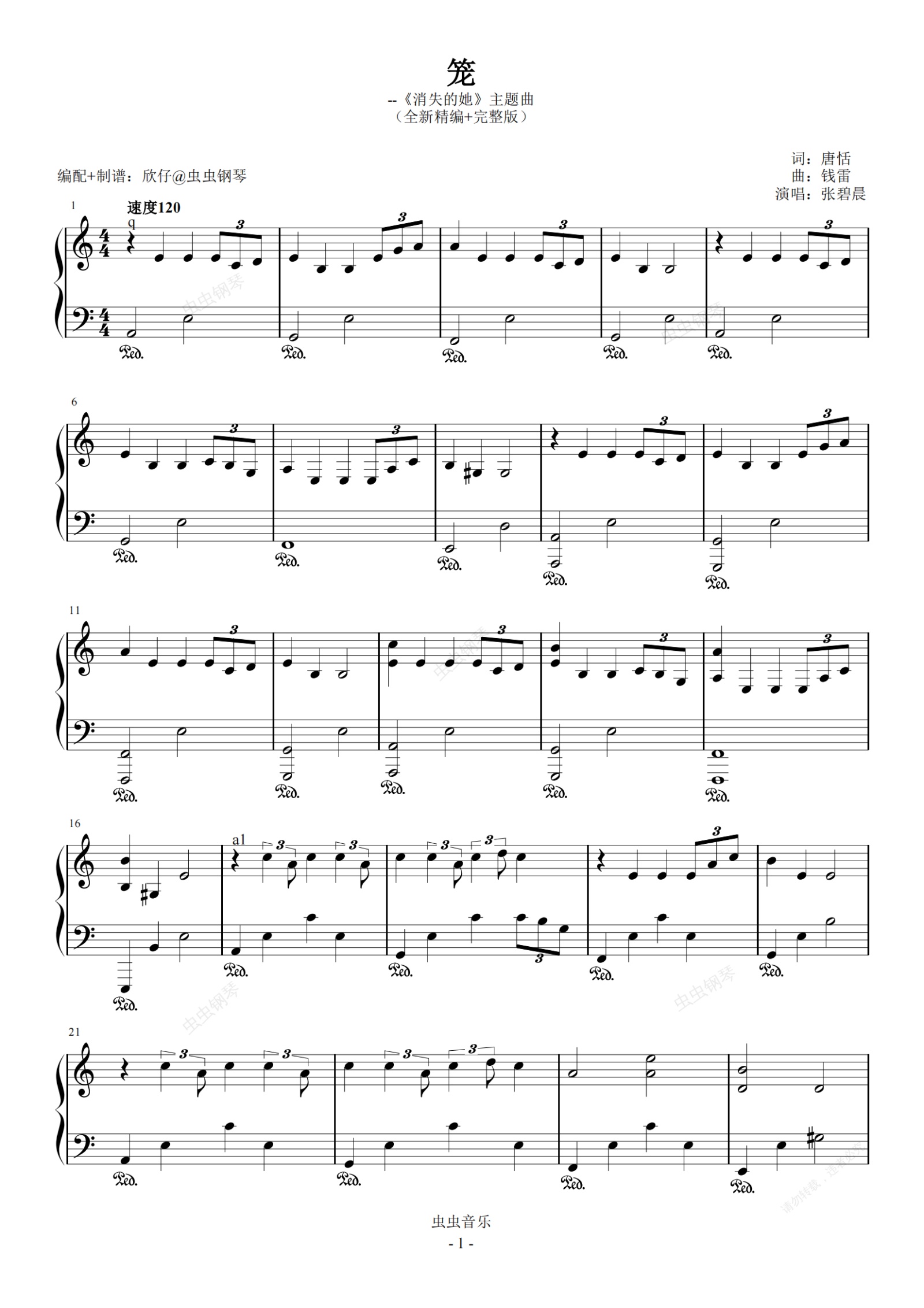 钢琴谱:张碧晨-a《笼》(《消失的她》主题曲、完整版)
