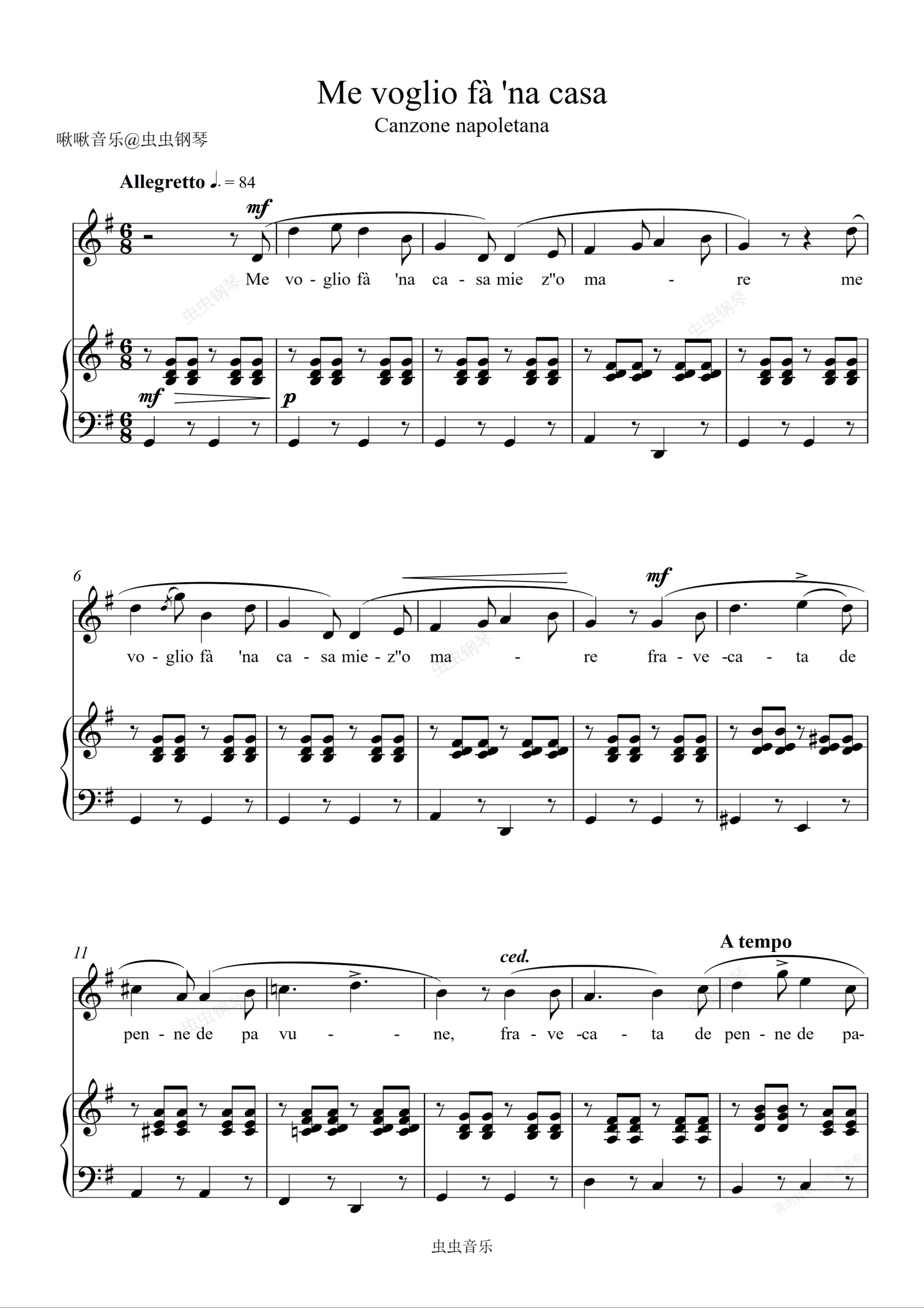 钢琴谱:Me voglio fà 'na casa 《我要建一座王宫》 钢琴弹唱伴奏谱
