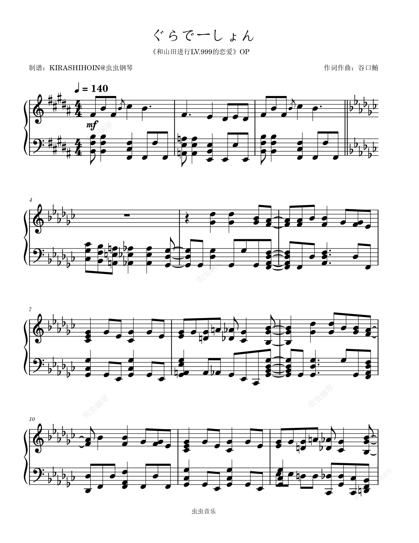 钢琴谱:ぐらでーしょん(《和山田进行LV.999的恋爱》OP/片头曲)- KANA-BOON