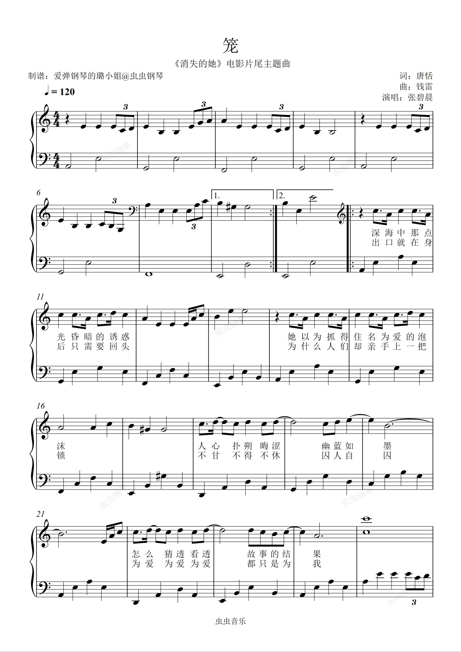 钢琴谱:笼《消失的她》主题曲 - C调简易版 - 附歌词