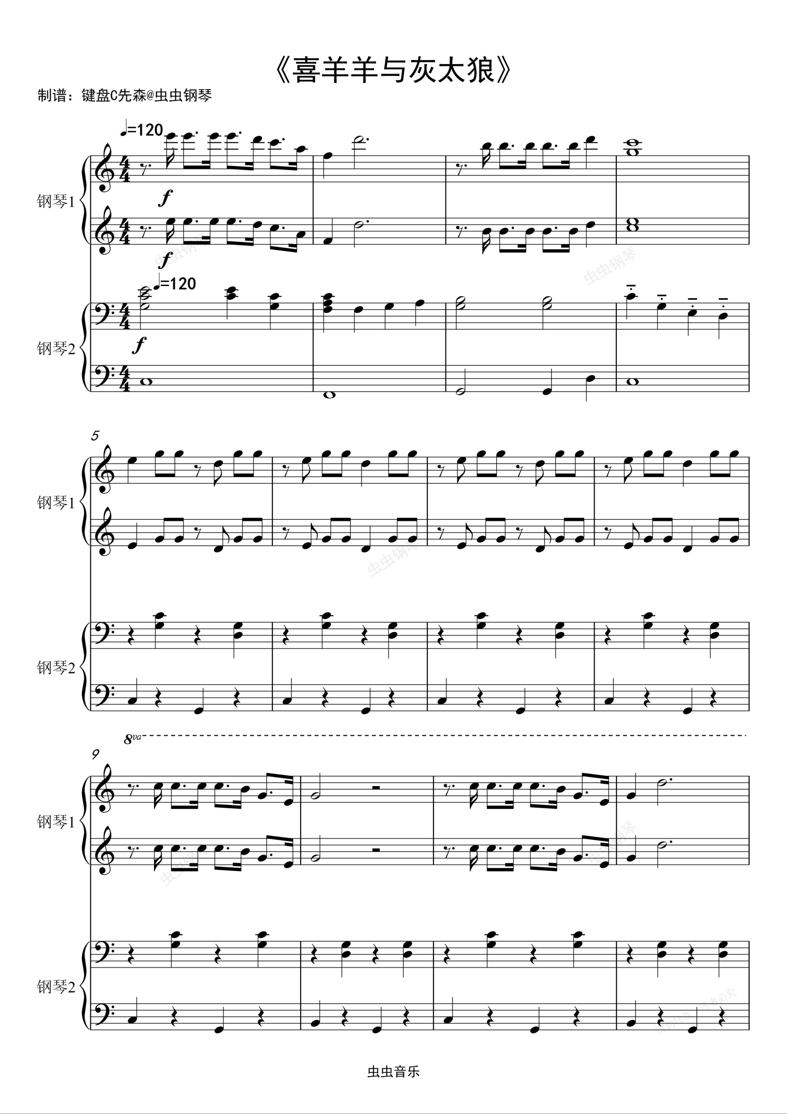 钢琴谱:喜羊羊与灰太狼-四手or双钢 C调